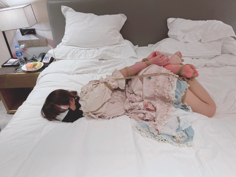 可怜的茶茶双腿几乎熔铸为一个整体,真真切切的体会到了什么叫动弹不得!直臂本就是最难以挣扎的绑法之一,盘腿驷马的支撑能力让茶茶连自己翻身都做不到,更绝望的是这次手指脚趾都被绑起来,此刻的茶茶连动动手指脚趾都成了奢望。一个活泼可爱的少女就这样被绳子连接成了一个整体,真真正正的和物品一样,只能趴在原地挣扎,连一厘米的移动都别想做到了。