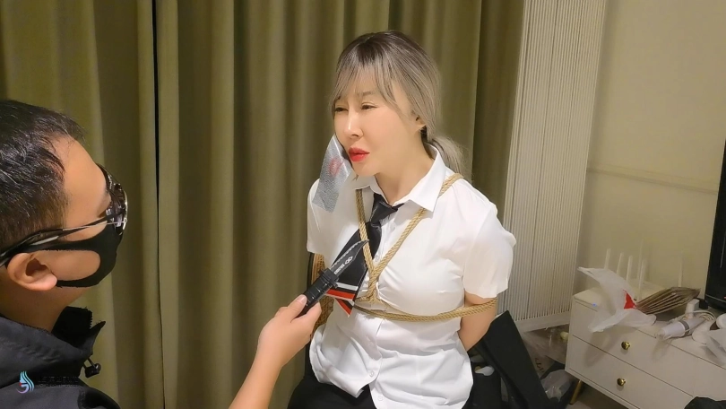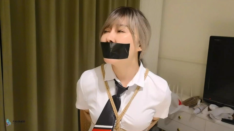 女人下班回家被劫匪入室抢劫,劫匪命令女人用胶带封住自己的嘴,并用绳子把她绑在椅子上,然后寻找财务。这时女人同事打来电话,劫匪让女人接电话,威胁女人好好配合。挂断电话后,男人命令女人脱下衣服进入卧室,在卧室里找到一双女人穿过的丝袜,塞进她的嘴里,并用胶带封嘴,捆绑全身。女人在床上不断挣扎。过了一会外面没有动静,女人以为劫匪已经离开,便起身跳到客厅逃跑。劫匪并没离开,被逮个正着,他解开女人身上的束缚,用扎带将女人捆绑,然后用毛巾塞进她的嘴里。并把她带到浴室,把她拴在淋浴杆上,劫匪离开。