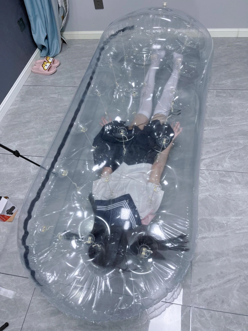 茶茶可爱的白丝小脚被气囊死死压住,拼命踢蹬着,却没有任何办法逃脱。透明的充气床让茶茶的挣扎的姿态完全展示在所有人面前,连 一点点遮掩的可能性都没有,羞耻程度拉满...