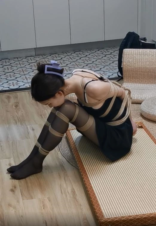 模特果果,多绳直臂捆绑,吊带连衣裙配黑丝,口含口球捆绑放置,绳子偏松散了点,模特却很唯美。