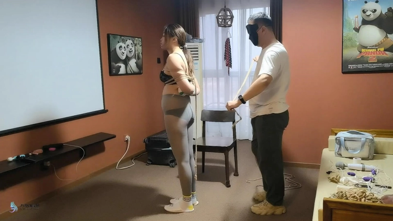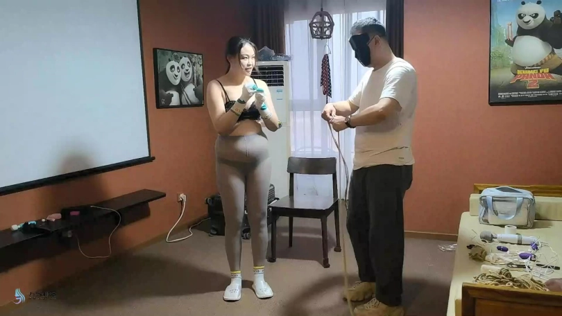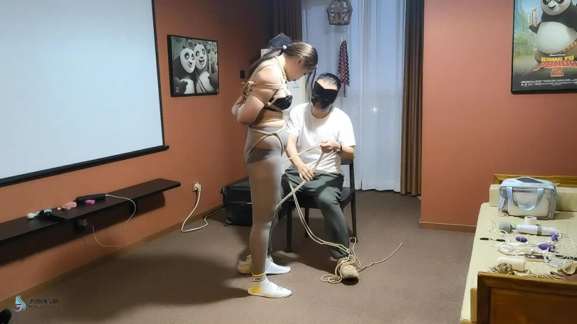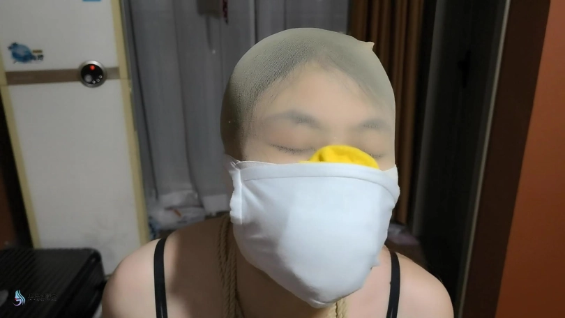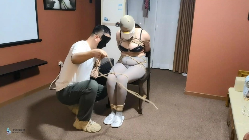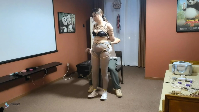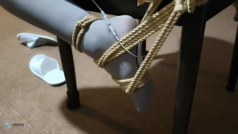 露楠穿着内衣和丝袜,每个手上都让她攥住一只袜子。然后外面再套上一双棉袜。用胶带缠绕手部,让她的双手攥成一个拳头形状。然后用绳子将她的全身紧紧的捆绑起来。捧起她的棉袜脚,不断的挠痒玩弄。她的脚部比较怕痒,不断的挣扎着。脱下她穿了一天的棉袜。将一只袜子塞进她的嘴里,外面封上胶带,防止她吐出来。然后再用丝袜头[X_X]在她的头上,这使得她的头部轮廓看上去很美。只要她每次呼吸,都会被迫闻自己臭袜子的味道。然后在用绷带缠绕她的口鼻,然后最外面再给她戴上一只口罩,口罩里面放着她穿过的另外一只棉袜。袜尖的部分也是味道最浓的地方,将这部分对准她的鼻子处。这样做可以降低她的声音。也可以限制她的呼吸,使她没有力气反抗逃脱。她的双脚也被抬起来向后弯曲固定在椅子上。然后用D击贴片分别贴在她的脚心,大腿和肚子上。电力持续输出,丝袜里也放进一个[X_X],不断刺激着她下面的小豆豆。胸部也分别放进两个TD刺激着。再这些玩具的不断刺激下,很快露楠开始被刺激的疯狂的挣扎,喊叫。但她只能发出轻微的“呜呜”声音表示抗议。但这没用,我并不打算放过她。随着时间的推移,露楠再一拨又一波的高C刺激下,体力被耗尽,无力的瘫软在椅子上。。。