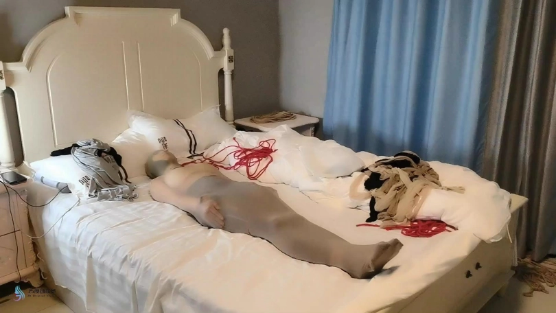 “激辣”穿着内衣和丝袜。用丝袜把她捆绑起来,再用一双超大丝袜袋将她包裹在里面。嘴里塞进一只超大口球。捧起她的脚玩弄,挠痒。用棒棒刺激她下面,她不断地发出呻吟声音。。。