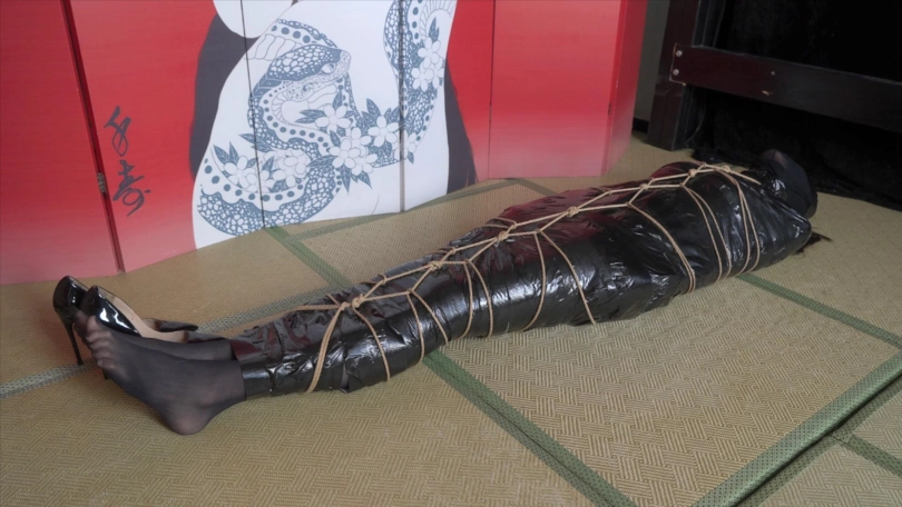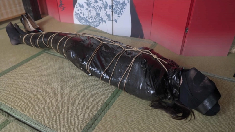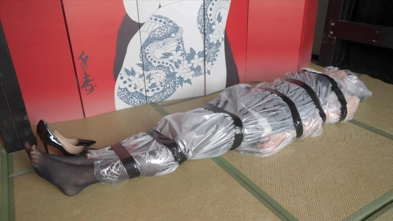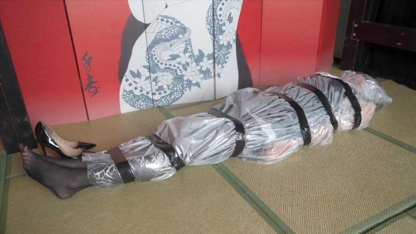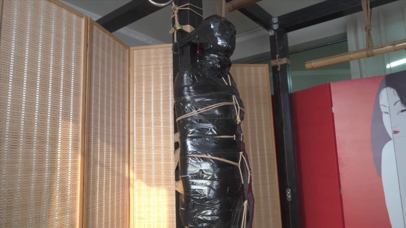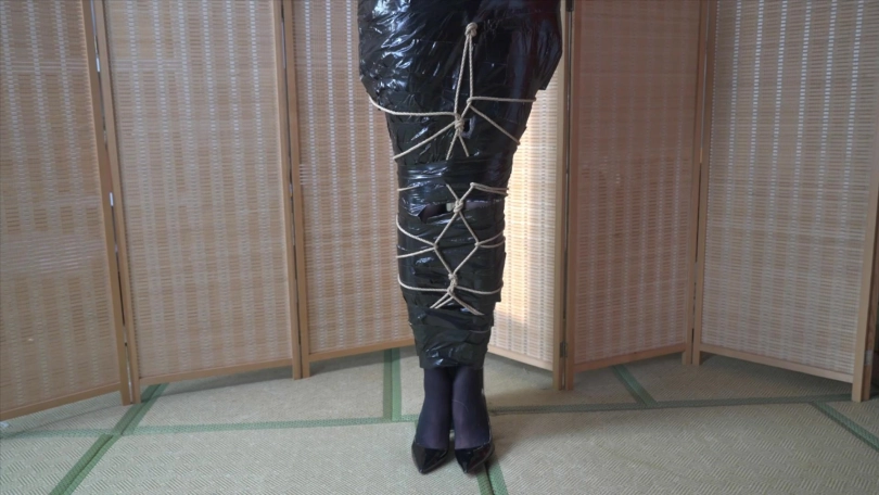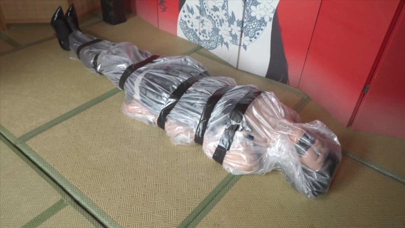 3,用透明塑料袋包住整个人,胶带封口固定身体