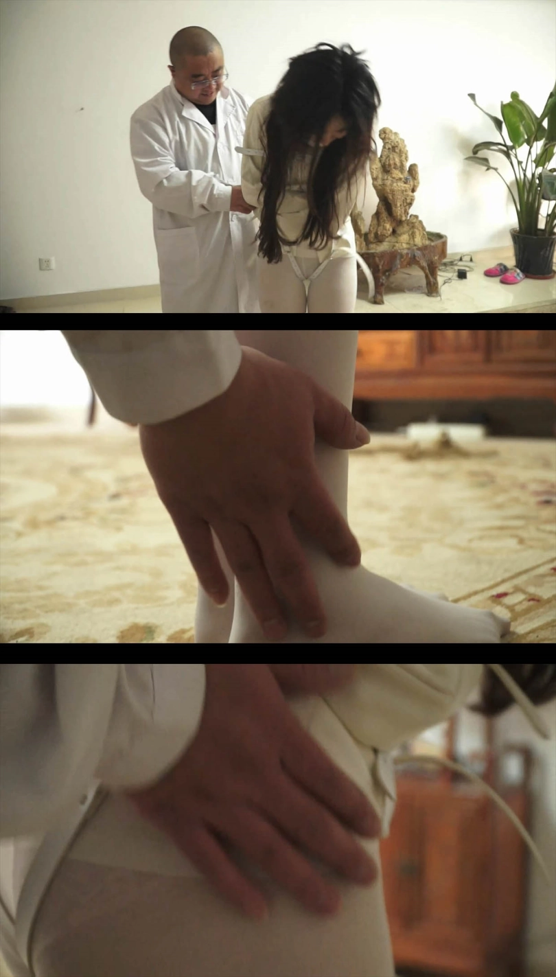医生拿出个小机器按了一下,女警的丝袜美腿突然自己并拢站直了,女警怎么挣扎都分不开了。