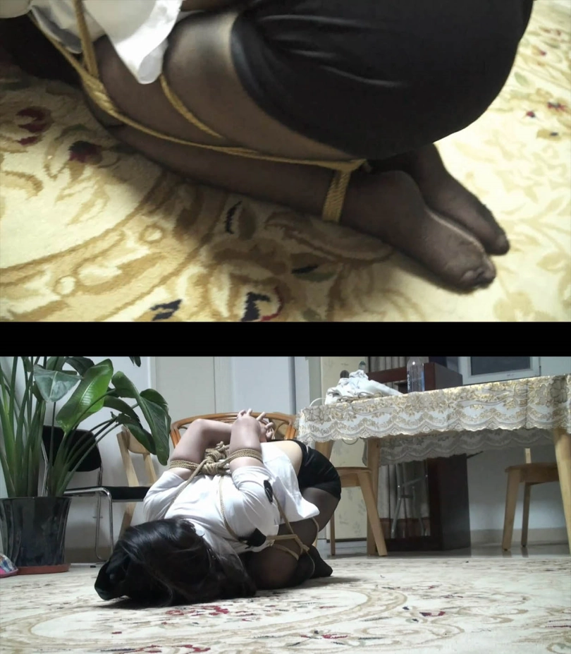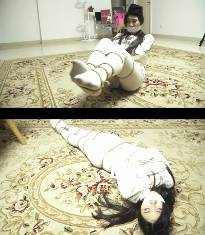 美女又换回了拘束衣,绳子把她的丝袜美腿捆绑到一起了。