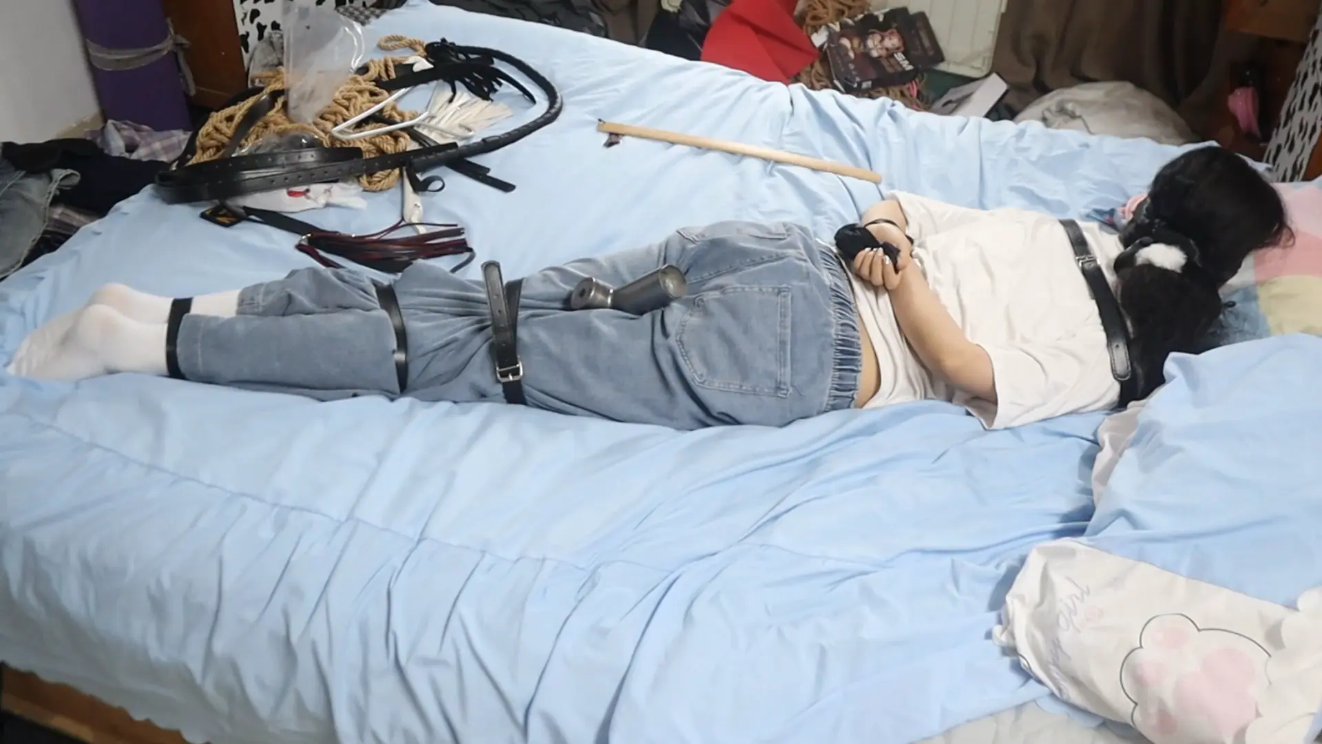 线下真实调教高挑白袜牛仔裤素人女孩小心翼翼来接受男主调教,一进门就见到各种各样的鞭子害怕又兴奋