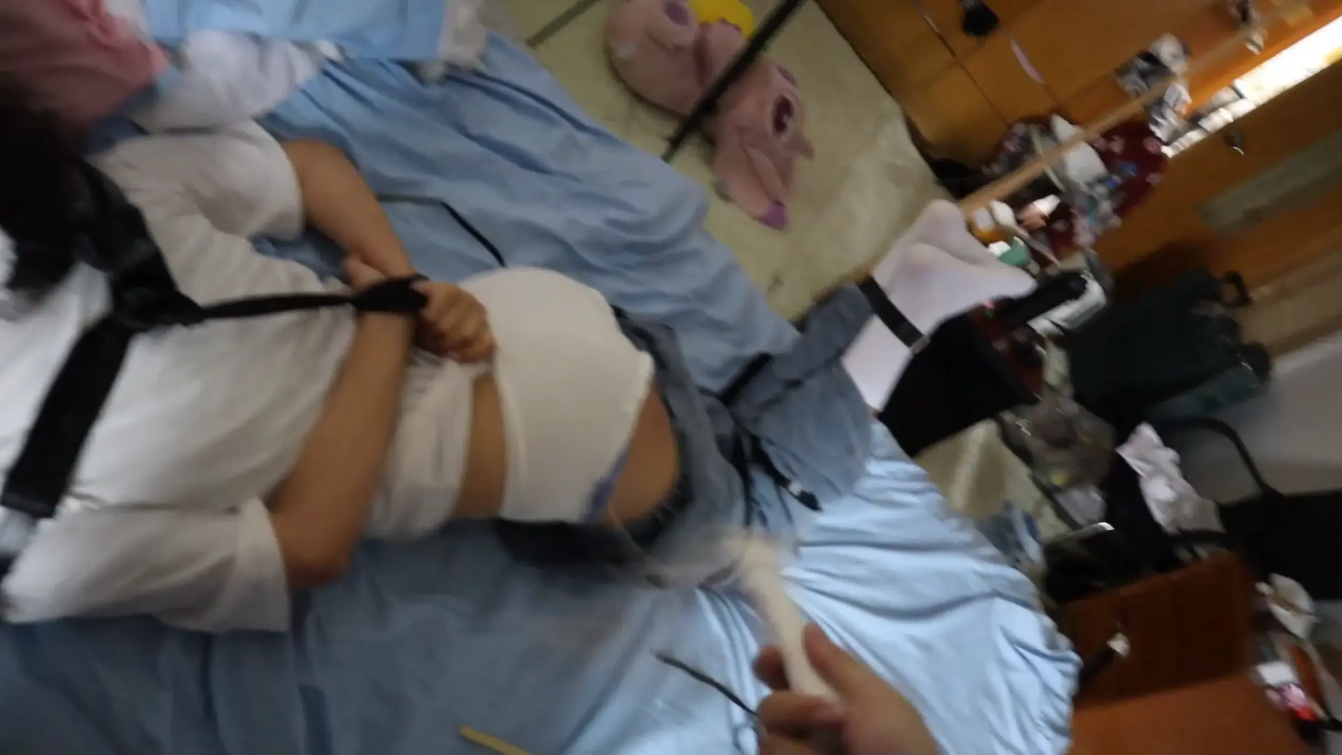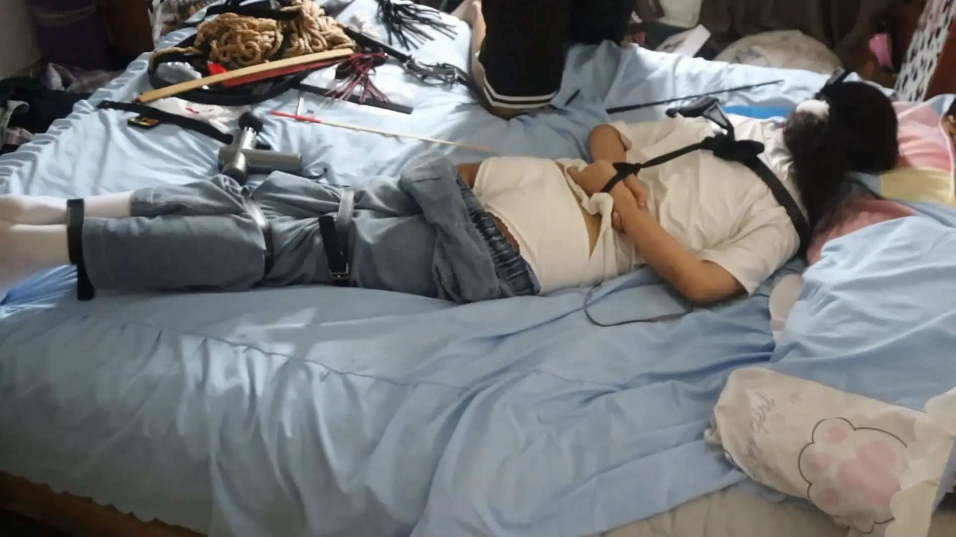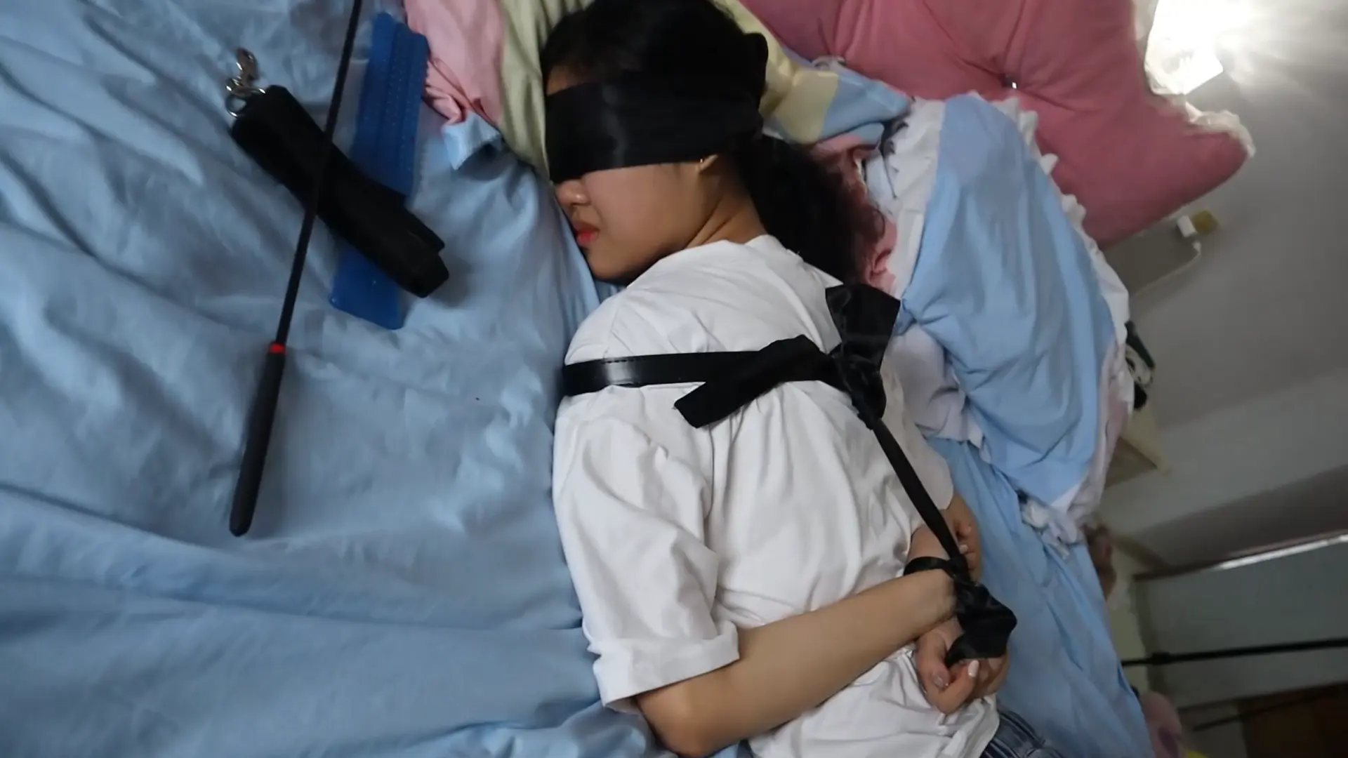 【荷仙少女】线下真实调教高挑白袜牛仔裤素人女孩小心翼翼来接受男主调教,一进门就见到几十种鞭子sp害怕又兴奋,皮带绑好身体手脚,纯记录双视,鞭打到后面痛苦挣扎直接大声哭泣喊道便报数边喊谢谢主人