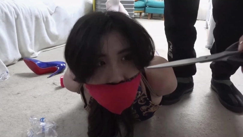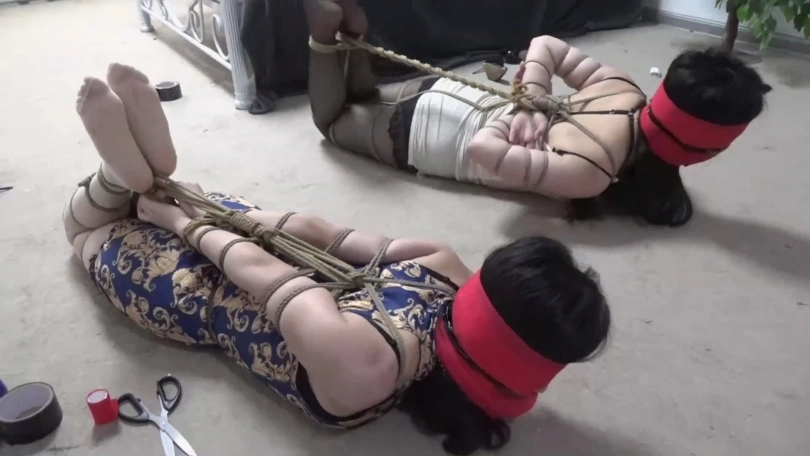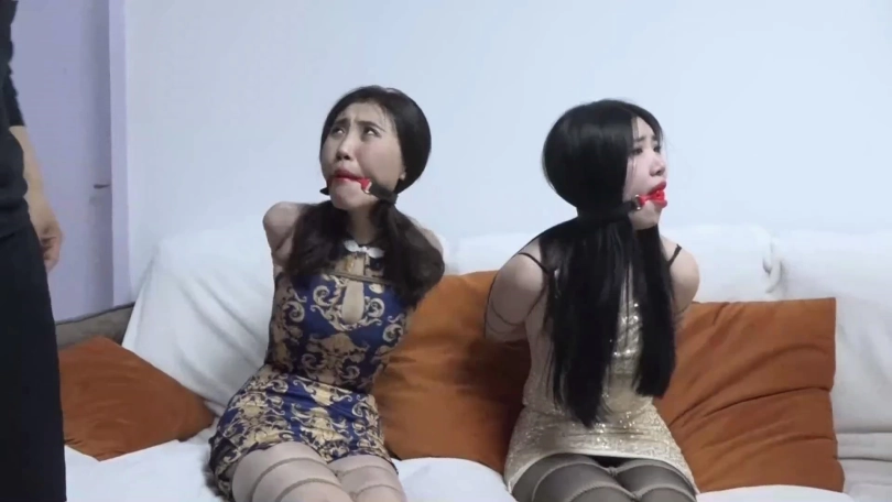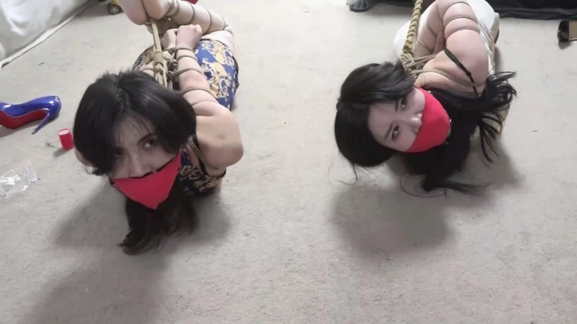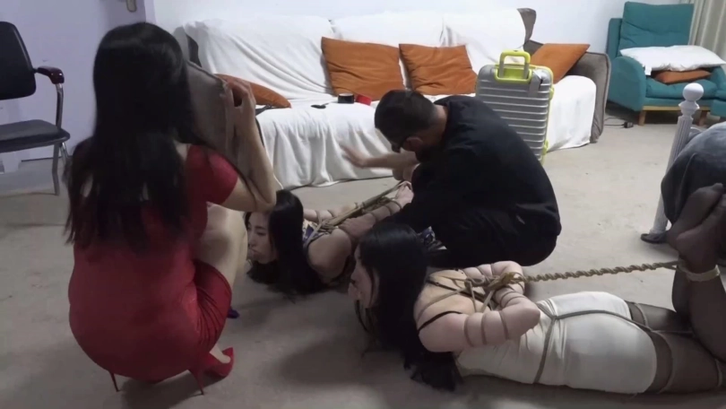 李然锁哥拿着绳子手背后慢慢靠近吴晗关琳琳二女,二女还以为李然夫妇收拾完东西准备还钱,没想到猝不及防被袭击严厉捆绑起来,关琳琳被欧式直臂捆绑,吴晗被五花大绑捆绑,两人双腿膝盖脚踝也被并拢捆绑多道。