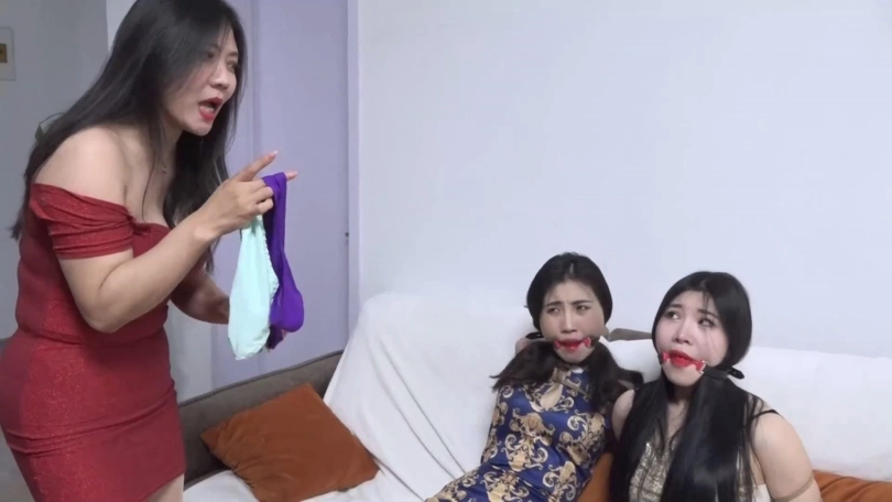李然锁哥生气将二女捆成驷马,而后为了惩罚她们,李然脱掉脚上穿的3双肉色短丝袜和一条肉色连裤丝袜,把3双肉色短丝袜依次塞入吴晗口中,再把臭烘烘的肉色连裤丝袜塞入关琳琳口中,令二女苦不堪言直翻白眼,而后李然锁哥用电工胶布剪下5张分别封在二女嘴外,用静电胶带缠绕5圈,再用红色自粘绷带缠绕5圈,把吴晗关琳琳二女嘴巴封堵严严实实。