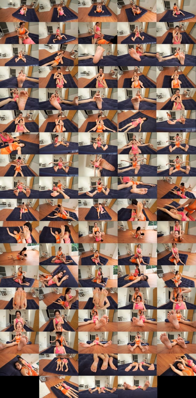 Suki (Orange) wrestles with Hana (Pink). Suki got the upper hand at the beginning of the match and knocked Hana out multiple times then she humiliated Hana by squeezing her mouth and opening her eyes at the end of round 1. Hana then took revenge on Suki in the other half of the video. In the end, both girls manage to knock each other out and the viewer can have a nice view of their pretty soles :D