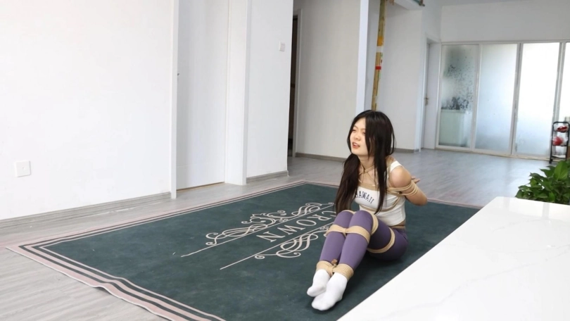 (男友离开房间,留下菲儿独自一人在房间里挣扎)菲儿独自挣扎,想法设法挣脱捆绑未果。男友回来后,看到坐在地上仍在扭动的菲儿,捏捏菲儿的脸,手在菲儿的双腿上来回磨蹭:哟,看来绳子捆得太松了嘛,我们的逃脱大师都不屑解开呢。