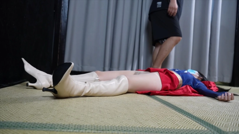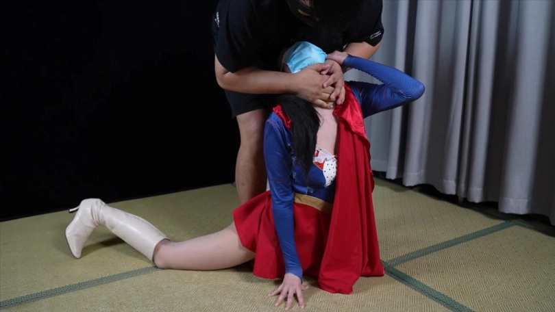 又是一番玩弄后,把女超人倒吊在了竹竿下,离场!