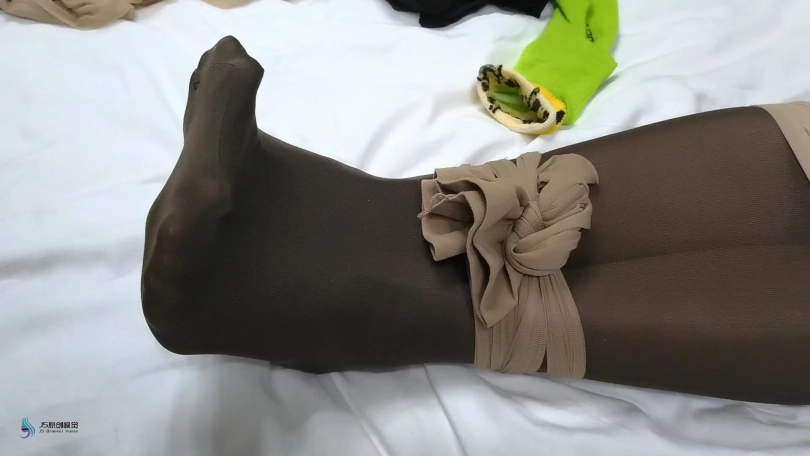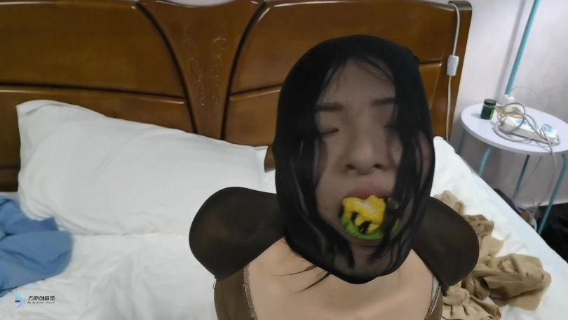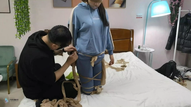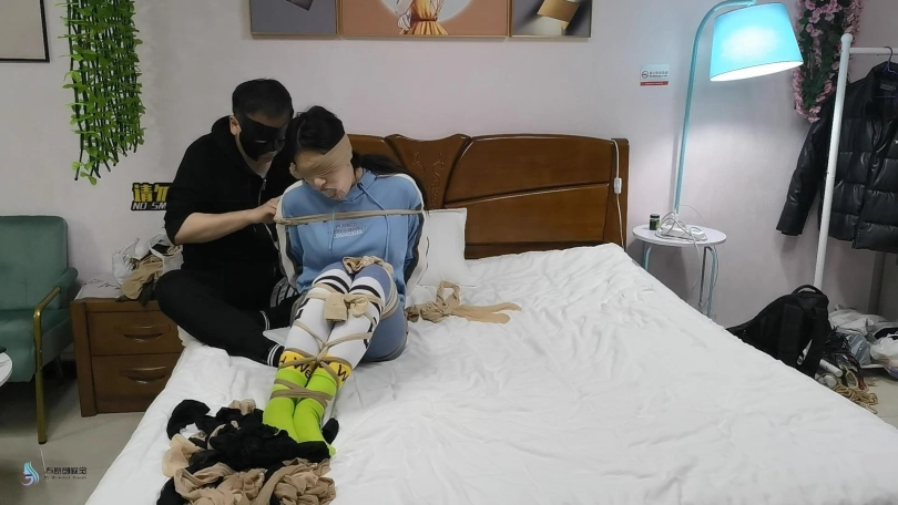 劫匪命令女孩脱去外套。并让她将一条开档的连裤袜当作上衣穿在身上。女孩的两条腿也被套在一条连裤袜中。劫匪用一天条裤袜将女孩的手臂背在后面,套在里面。并用多条丝袜将她捆绑起来。做完这些劫匪并没有打算停下的意思。他将女孩穿了一天刚脱下来的棉袜塞进了女孩的嘴里,并用丝袜套在她的头上。女孩无助的挣扎着。但袜子强烈的味道熏的女孩没有力气挣扎,无力的在床上躺着。。。
