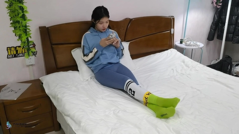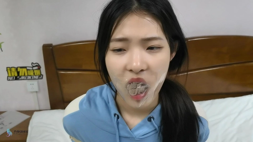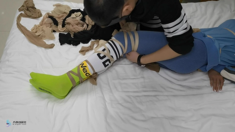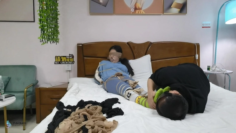 美女在外运动完回到家中,躺在床上休息。但是她忘记了锁门。一名劫匪悄悄的进入房间,并挟持了她。劫匪用她积攒没洗过的多天条丝袜,把她全身捆绑起来,嘴巴也塞进丝袜吧,并用胶带封上。劫匪不但劫财还要劫色。她不断的抚摸着美女。亲吻她的美足。搂着她入睡。当劫匪醒来时告诉女孩,告诉她乖乖的待着,他一会回来会有更好玩的。