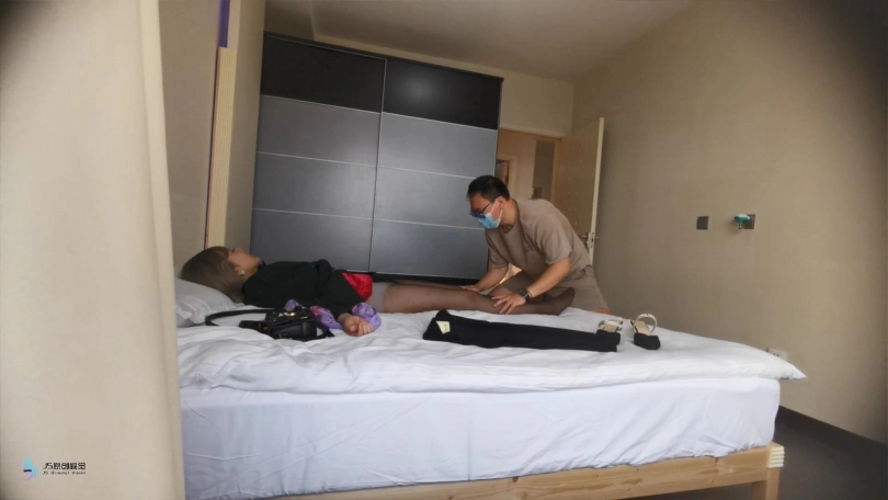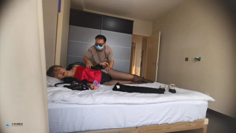 下一个场景,这名神秘人将她抱进了一间密室,把她放在床上,将之前放在后视镜的摄像头在床边架设好,对准这位女金领,先解下她的围巾,脱她的高跟鞋,然后再脱她的裙子,接着脱她的外套,只剩下蕾丝吊带内衣和连裤丝袜,并摘下她的耳坠,解散了她那干练的发髻。期间多次抚摸她的脸和身体,用绳子将她的手和脚绑在床的四角,用解下来的围巾塞住她的嘴,把她的包包里的东西全部倒出来,然后把从她身上脱下来的衣服、高跟鞋、包装进了一个白色透明的袋子,对着摄像头又做了一个Yeah的手势,带着袋子离开了。在对她做了一小段特写后,她的眼睛逐渐艰难地睁开,但她刚苏醒时虚弱无力,眼睛一度闭上,想再睡会儿,这时她试图换个睡姿,但动了几下,发现四肢都被约束在床的四角,然后头如触电般起来,发现了自己被扒得只剩内衣和连裤丝袜,并被绑在床上的事实,顿时困意全无,脸上露出慌张的表情,想发声,但奈何自己的围丝巾堵住了嘴,然后开始了一小会儿徒劳无用的挣扎,发出很大的“唔唔唔”声。