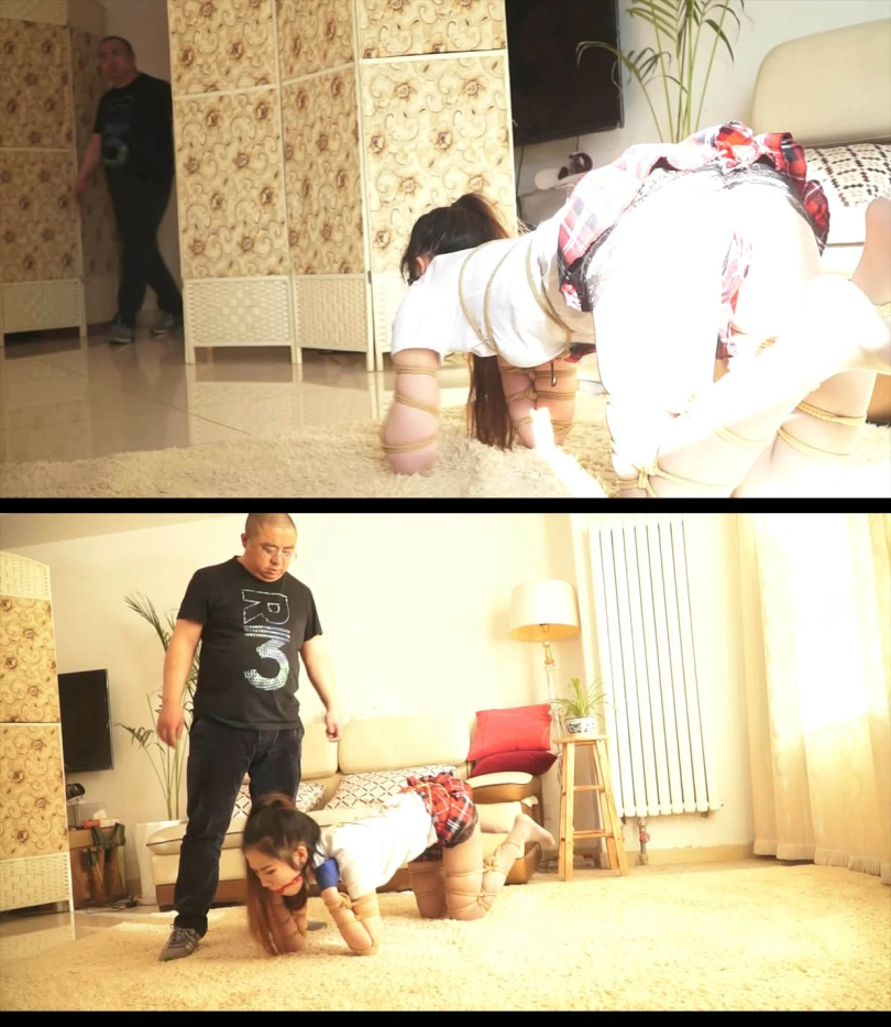 坏人用绳子抽打她,强迫可怜的女学生在客厅像狗一样绕圈爬。