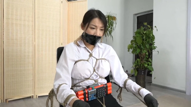 男人递过一张纸条,上面写着拆弹游戏,待会你搭档会过来救你,如果他解开你身上的任何东西,都会引发炸弹爆炸,但是可以通过密码解开,密码在桌子的手机上,密码是AZ3T,全凭你们的配合了,男人到来,试图解开女人的束缚,女人激烈挣扎,拼命暗示桌子上的电脑或则手机男人来到电脑前,女人呜呜并点点头,密码:AZ3T1E,女人努力提醒,美女模糊不清的喊声密码,但是到E哪里太难发音了,模特呻吟很久都听不清,男人好不容易输入,一直和1混起来,男人随便输了个数字,女人激烈挣扎,男人担心炸弹爆炸,用胶布闷住女人鼻子,炸弹开始倒计时,男人离开,只留下女人在椅子上拼命挣扎,可怜的美女到底能不能逃出生天?