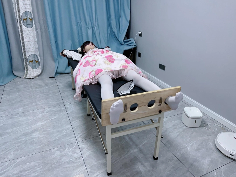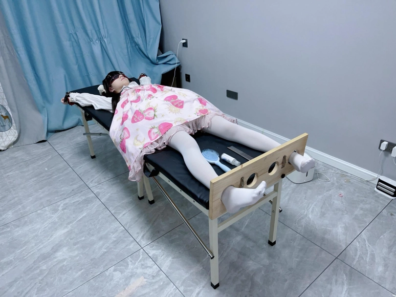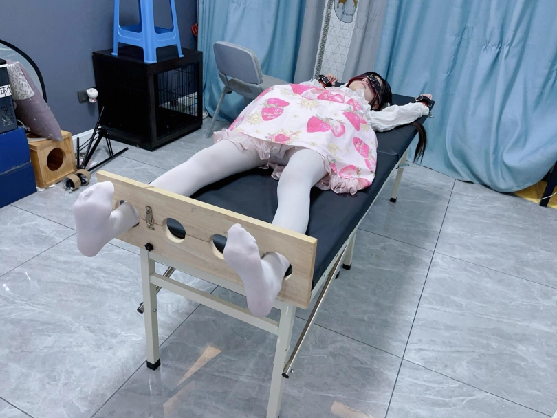 让茶茶穿着lo裙和白丝连裤袜,然后把茶茶双手举过头顶固定在痒刑床上,双脚也锁在痒刑床末端的足枷中。