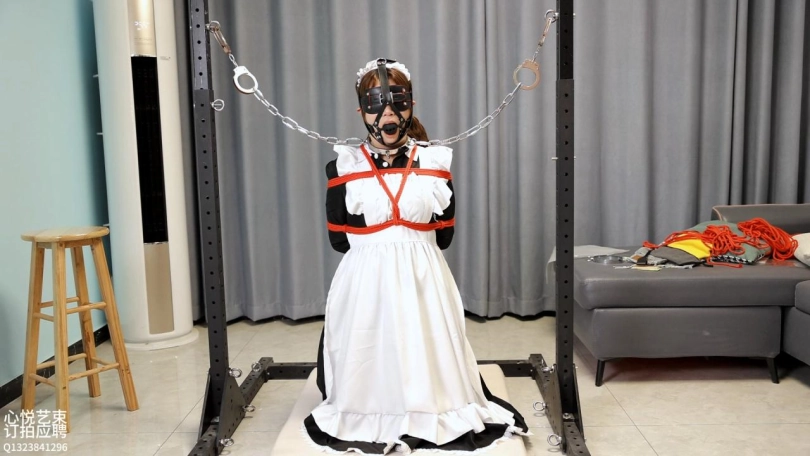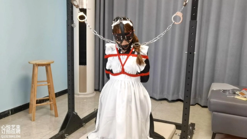 【心悦艺束】女仆的1小时超长放置惩戒。手脚被缚戴上马具口球钢铁项圈,锁在两根无情的铁架中间罚跪