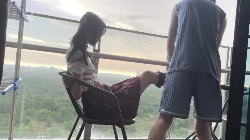 小鱼先是在房间里被日式绑起双手 然后被带到阳台把双腿固定在椅子上 最后小鱼在床上调皮惨遭主人的毒打