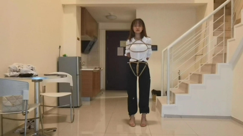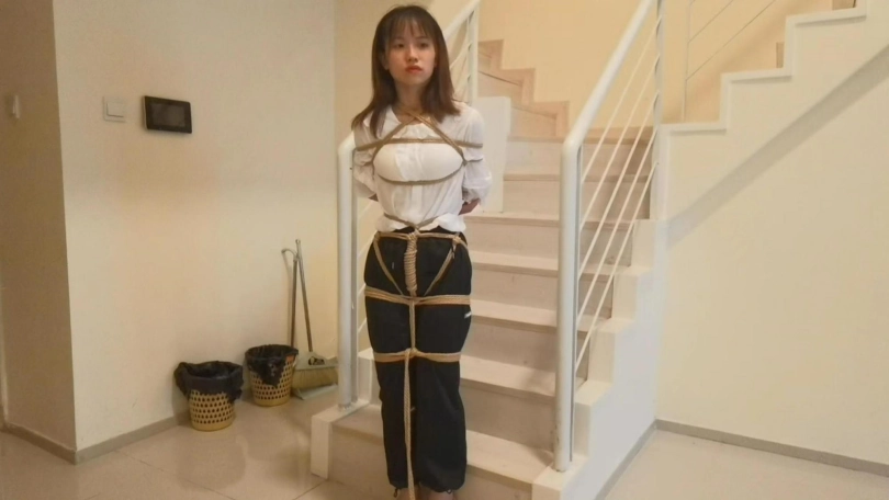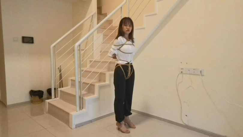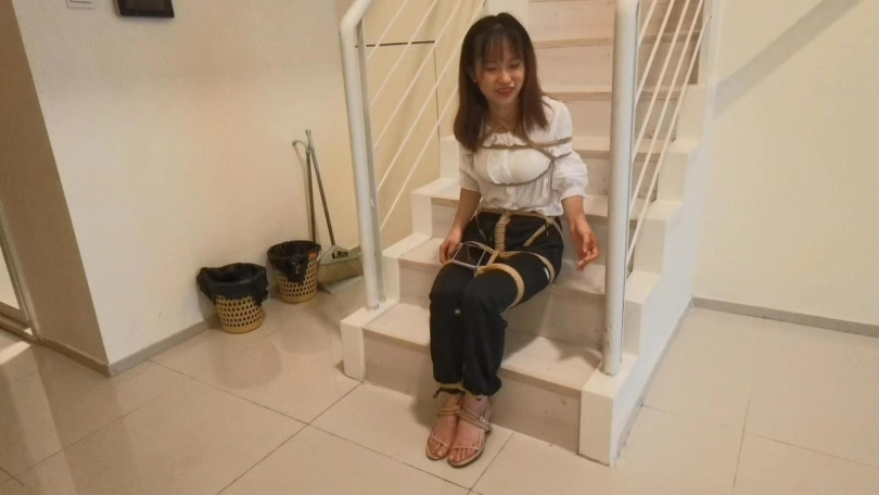 静静第一次体验绳艺就绑了个日式股绳坐楼梯放置,还是比较腼腆的,由于中途手麻了,只能被迫先解开休息一会在继续绑