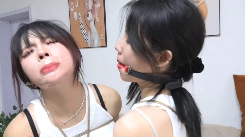 2个美女回到客厅决定先解开拘束。2个美女奋力挣扎蠕动,互相摩擦身体和丝袜美腿。2个人卖力的互相磨蹭小嘴,几次都亲到一起了,但磨蹭了快2分钟都没弄开堵嘴。