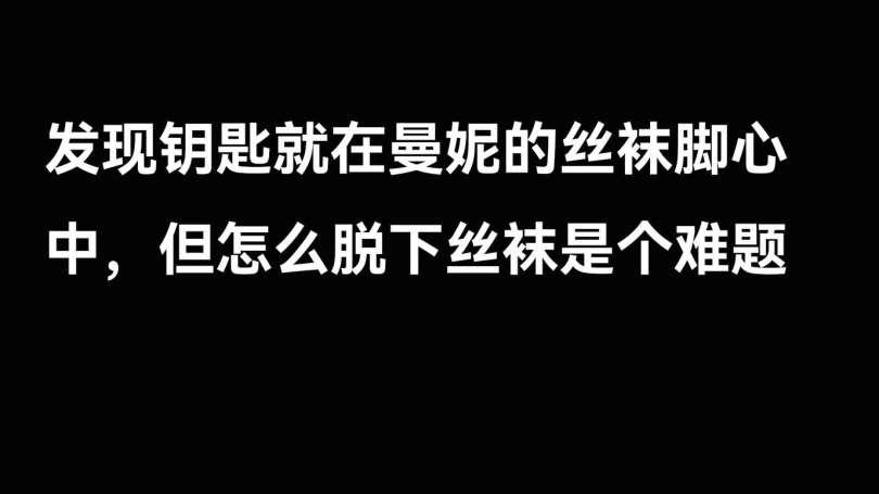 最后发现钥匙在曼妮的丝袜脚心,但要拿到钥匙就必须脱下丝袜。她们试着用手发现够不到。于是她们互相磨蹭丝袜腿,想把丝袜磨蹭掉。但由于是油光丝袜她们磨蹭了好久都没脱下。最后面具男说时间到,第一个挑战失败。要给她们惩罚。要把她们双脚也捆绑起来。