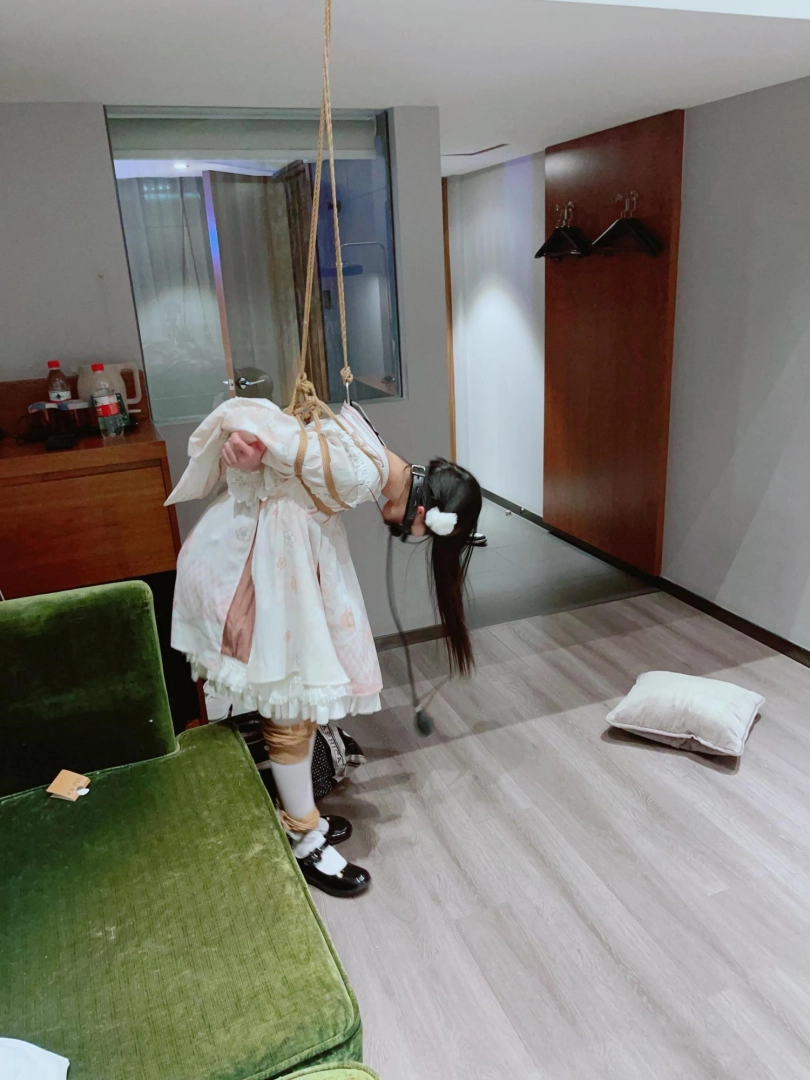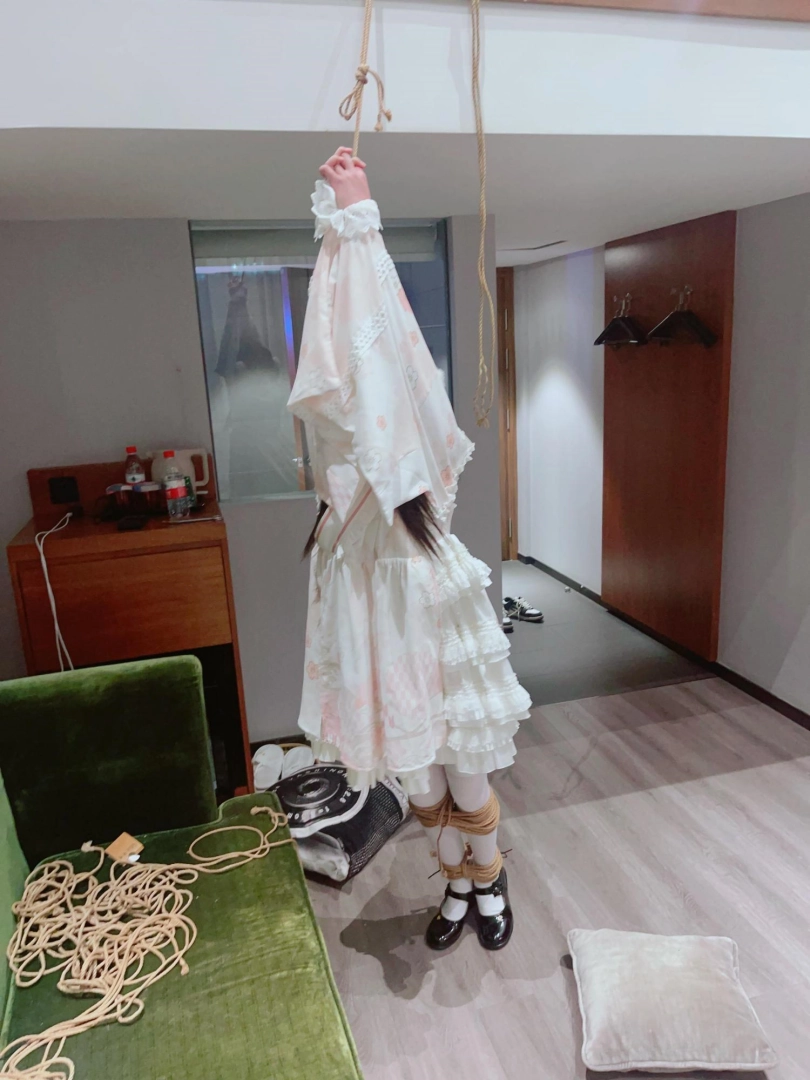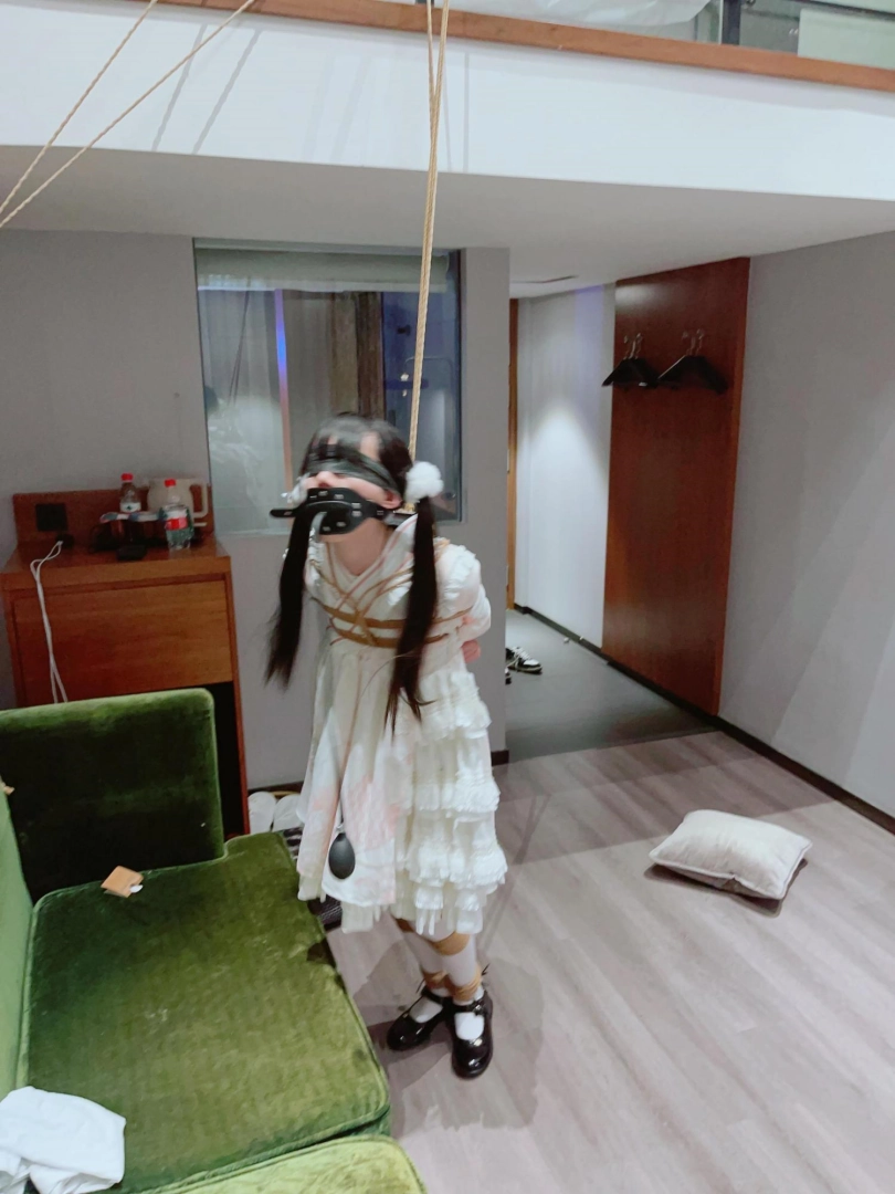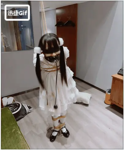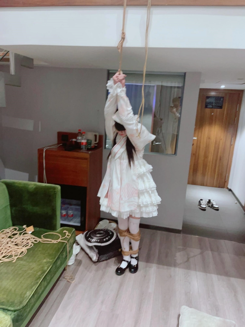 3.就这么折磨了一小时左右,茶茶突然崩溃大哭,拼命挣扎,不考虑任何重心,为了安全考虑我只能剪断了绳子,暂停拍摄。但是体力压榨不会这么轻松结束,我劝了茶茶几分钟,然后把茶茶双手举高,继续吊缚,双手举高罚站了十几分钟,直到茶茶完全疲劳绝望才放开茶茶。