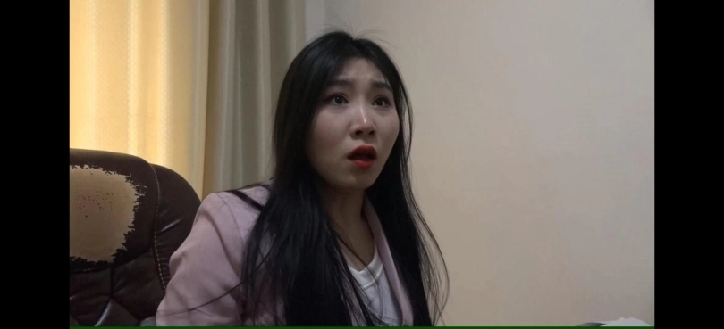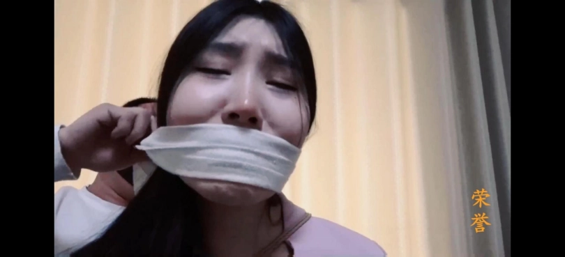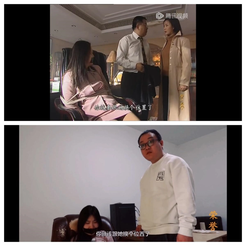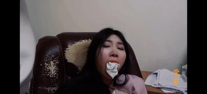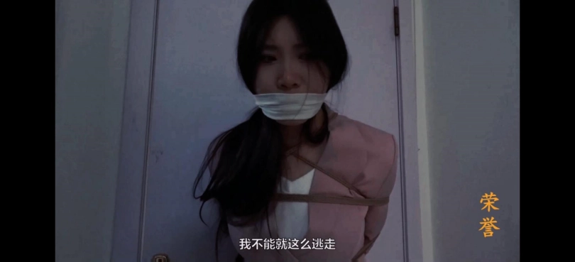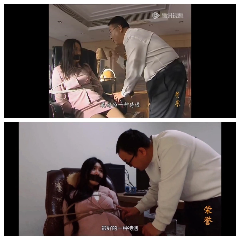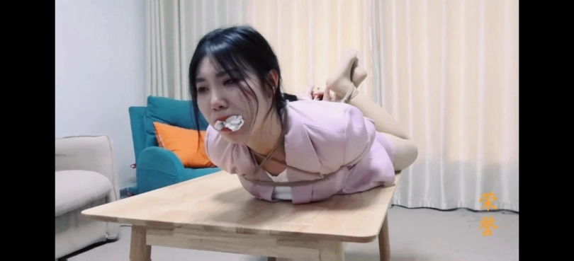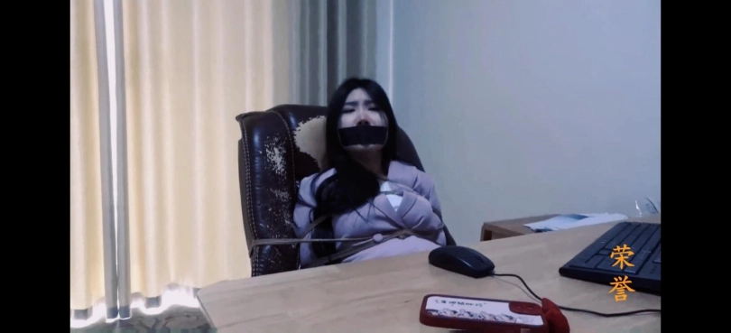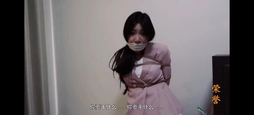 女秘书杨小莹,穿着粉色制服和厚肉丝袜,被绑在椅子上,黑胶带封嘴。