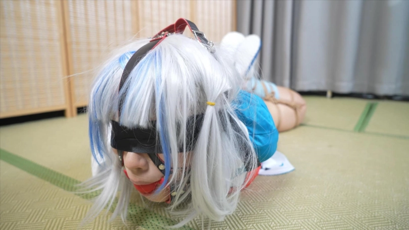 1.后高手,膝盖,脚踝都被绑住,床垫挣扎,企图逃跑