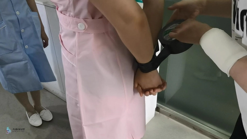 在下一个镜头,护士A及护士B的手腕已被胶带绑起,嘴里被棕色毛巾堵着,只能「呜呜」地叫。抢劫犯把她们带到手术室前,跟着拿走护士A口中毛巾,并叫她向在手术室内的医生说病人已到诊症室,请她尽快应诊。护士按着强盗所说的向手术室内的医生说。医生回复并说「知道了」。跟着,护士A被重新堵嘴。