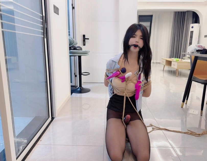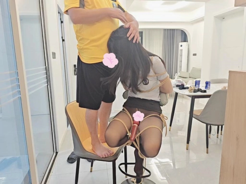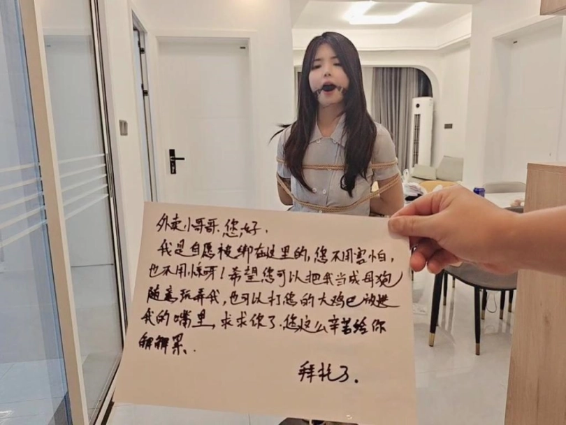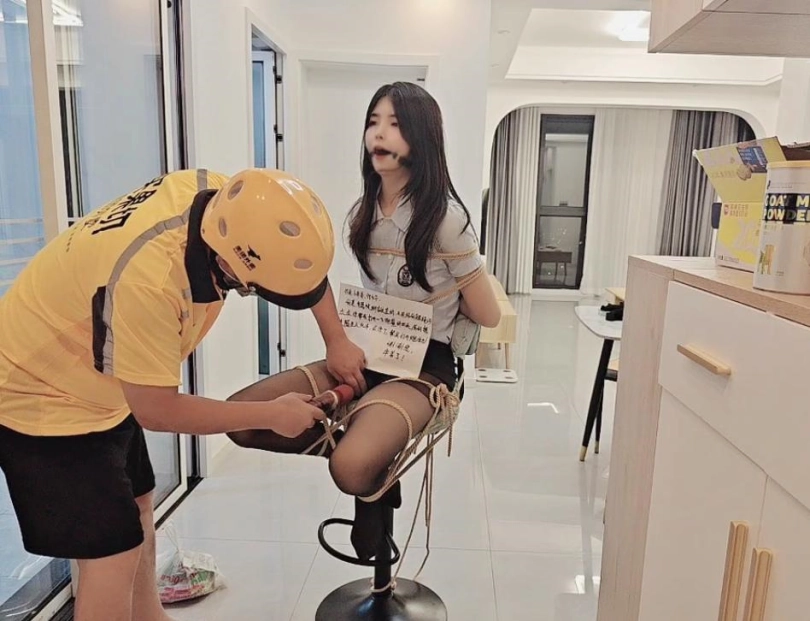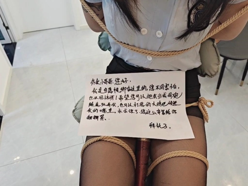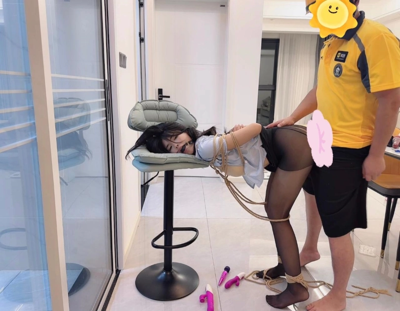 被固定捆绑在家门口的高脚凳上,然后放上棒子,跑基,各种玩具设备,之后,大叔打电话叫外卖,说不在家,门没有关,推门进去放桌子上一下,最后留下纸条,上面写着我是自愿被捆绑在这里的,拜托外卖小哥帮忙打开一下棒子,和其他玩具设备都可以,公厕,随便玩,3位外卖小哥有一个推门进来吓得撒腿就跑,有一个还算正常男人,最后一个达到了完全意想不到效果,总体来说此情此景,内心是羞耻到了极点的爽!!!
