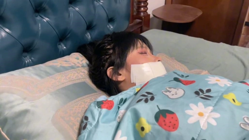 卧室, 曼妮在床上盖着被子只露出头。吴晗过来掀开被子,曼妮还是被捆绑在床上。吴晗还是对曼妮很恭敬照顾的态度