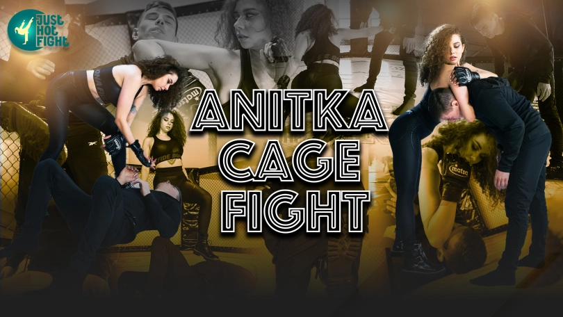 Anitka brings the guy who serves as her punching bag into the cage. He is afraid of her every blow and tries to cover himself with his hands. But Anitka keeps breaking through his defenses.