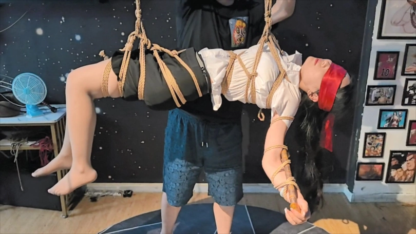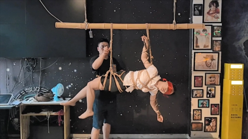 中国结竹竿缚侧吊空中转换驷马倒吊绑发