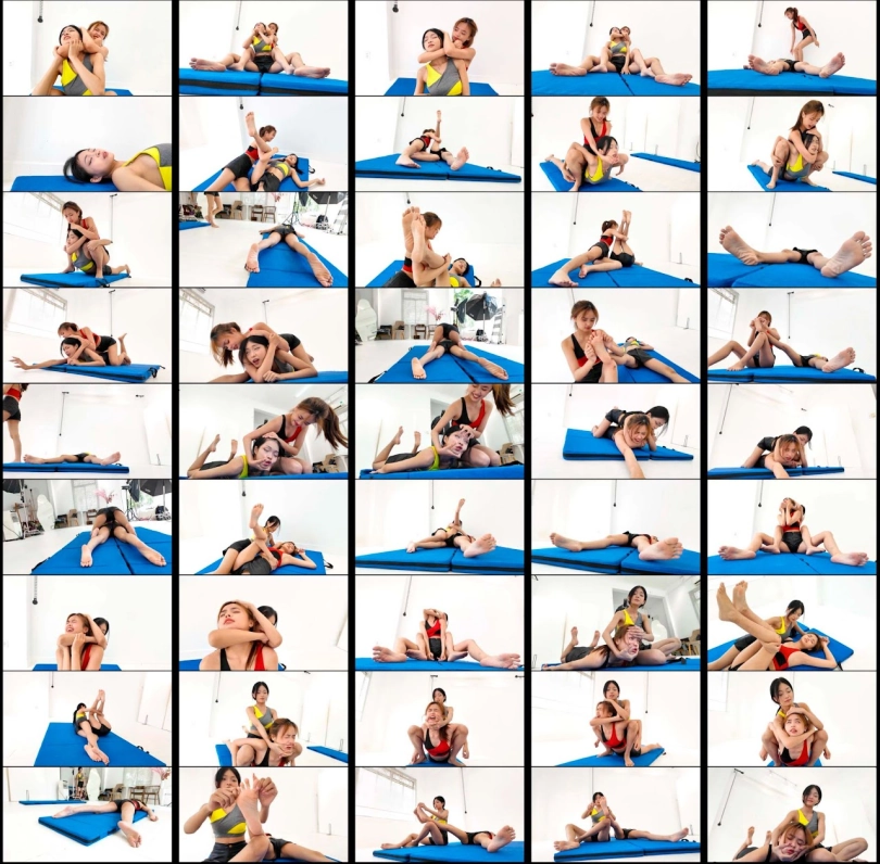 2 rookie girls: Haki (Red top) and Haki fight each other in a wrestling match with various wrestling moves like sleeper hold, camel clutch, and choke hold.