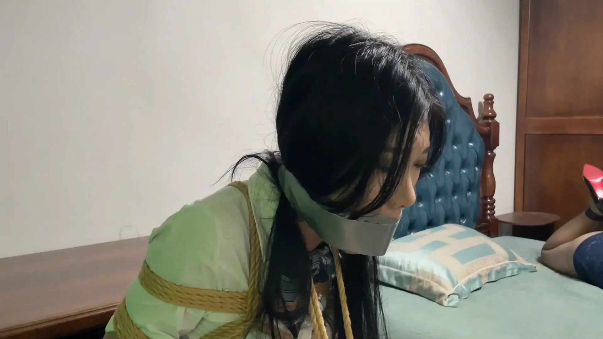 李然最终还是没能挣脱束缚,最后歹徒当着母亲的面,把女儿当成人质带走,留独自哭喊的李然一人在床上挣扎。