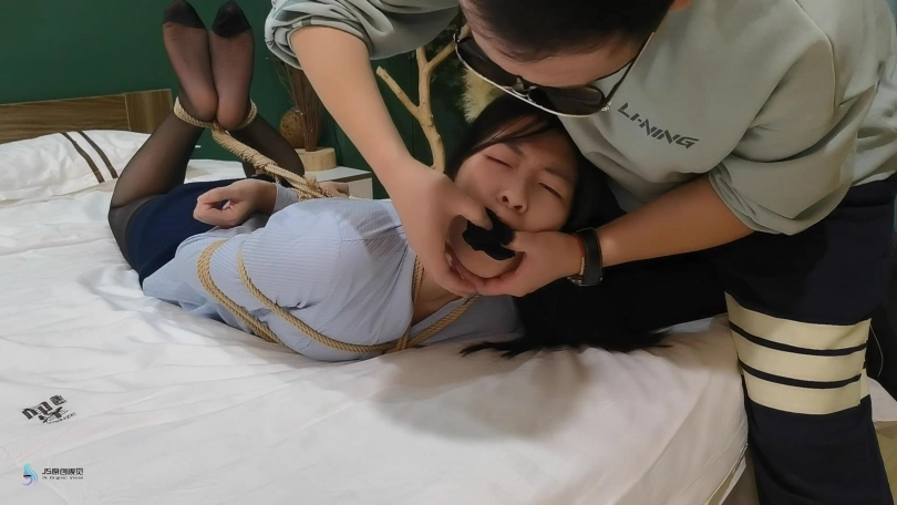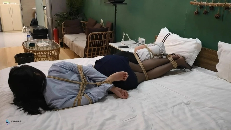 一对姐妹回到家中休息,一名劫匪潜入房间,将休息中的她们驷马捆版捆绑起来。一个女孩被塞着口球,另一个女孩嘴里被塞进丝袜。过了一会,劫匪给她们换了一个姿势,彼此的脚对着对方的头部捆绑在一起,让她们闻对方的丝足。女孩不断的挣扎,呻吟着。