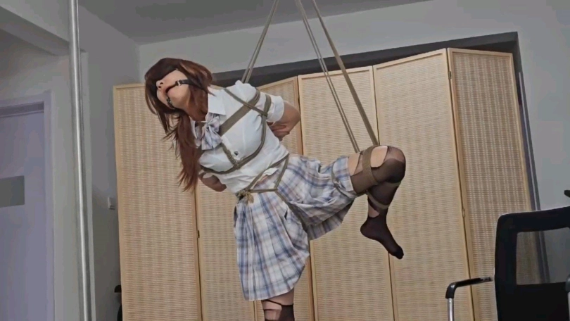 等美女醒来的时候已经被五花大绑了,单腿吊缚,美女意识到不对,于是拼命挣扎,这也引起了歹徒的兴趣,于是歹徒坐到了美女旁边,品味着美女的呻吟声。没过一会,男子觉得不过瘾,于是将美女的黑丝一点点的撕破,独自留下美女一人挣扎。