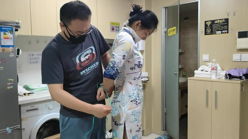 下一个镜头,这时的空姐已被绳子紧紧绑起胸部手腕及足踝亦被绳子绑着。贼人捆绑空姐后,便叫她跳到睡房内,并安排她坐在床上跟着便再对空姐说「我现在在你的房子里搜索贵重物品,你最好乖乖配合」空姐惊慌地望着贼人,从嘴里发出呜呜声并点头示意会配合。空姐在贼人离开睡房后,便尝试挣扎,不停扭动身躯,并不停发出呜呜声,希望外边房子的其他人能听到自己的声音。空姐一开始是坐在床上挣扎,过了一会后,便开始觉得乏力疲倦,她的脸上也充满了汗珠。空姐跟着便侧卧在床上。继续扭动着身躯。由于扭动身躯的关系,她身上的旗袍也被牵高,露出丝袜及内裤(这里可拍摄一下臀部特写)。空姐在挣扎了一会后,好不容易才把口上盖着的布条移除并吐出嘴里的丝袜。那只被吐出的丝袜,充满了空姐的唾液。空姐在吐出丝袜后,由于听不见外面有任何声音,一心以为贼人已离开,于是便疯狂地叫喊着,但这时贼人突然冲入睡房,空姐惊慌地望着贼人并说「大哥,我不敢了,我不敢了,请你不要伤害我」贼人跟着说「不对你作出点惩诫,你是不会害怕的」。