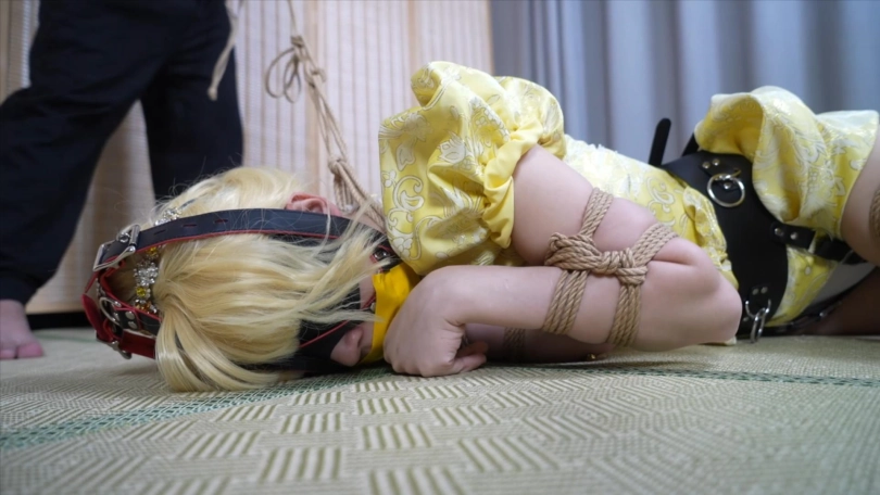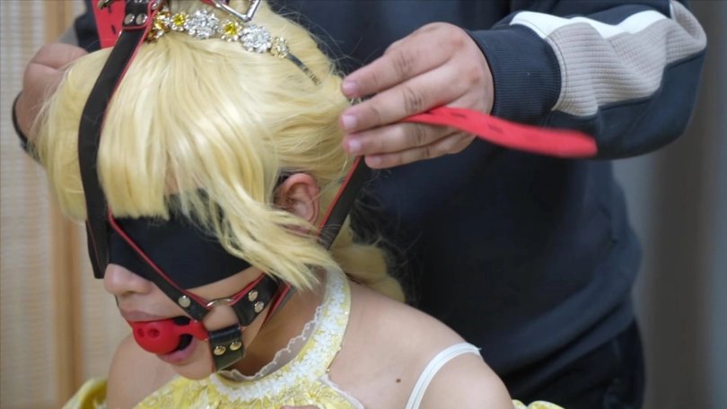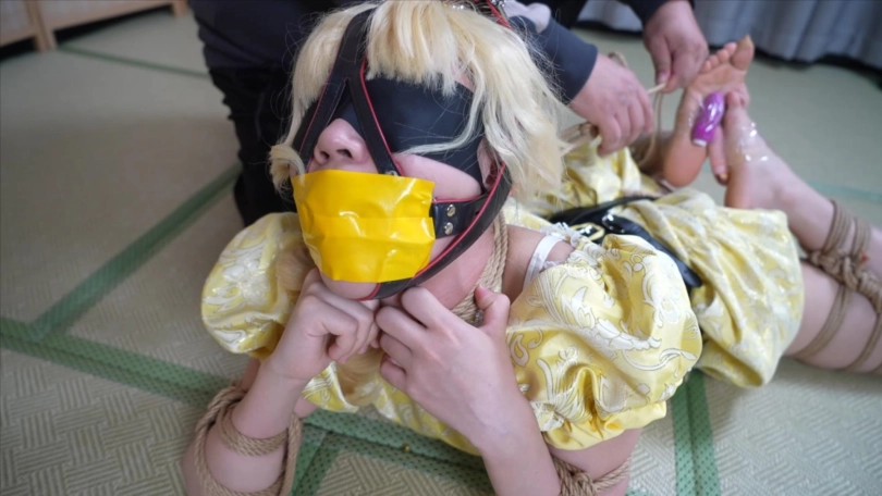 嘴巴塞进丝袜戴上马具口球,最外面再用胶带封住