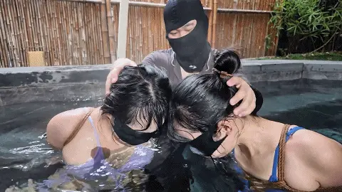 原来嗷嗷早已被捆好放在了水池中,姐妹两人被强制泡在水中被迫接受调教,男子先后按住两人的头部浸入水中,收紧的绳子和水池的热气让沉沉和嗷嗷没有力气喊叫,只能小声的喘气,一阵玩弄后男子将两人带入浴室,用花洒清洗她们的身体,男子命令被解开绳子的嗷嗷,用手抚摸清洗沉沉的身体(画面太美我就不多描述了,沉沉似乎很享受),结束后男子用浴巾擦拭两人的身体。