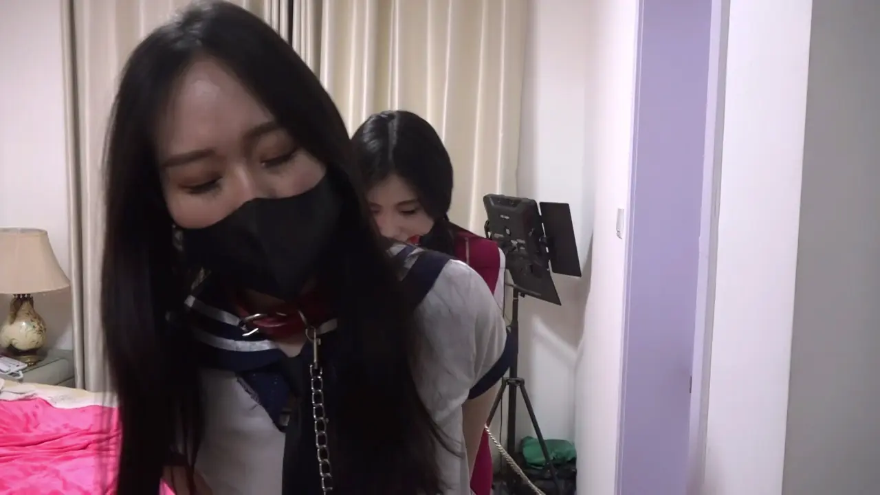 杨丽娜和黄珊珊两女被锁在卧室里,双手被拷在身后,双脚戴着镣铐,嘴巴被口球堵着。脖子上戴着项圈连着床脚。