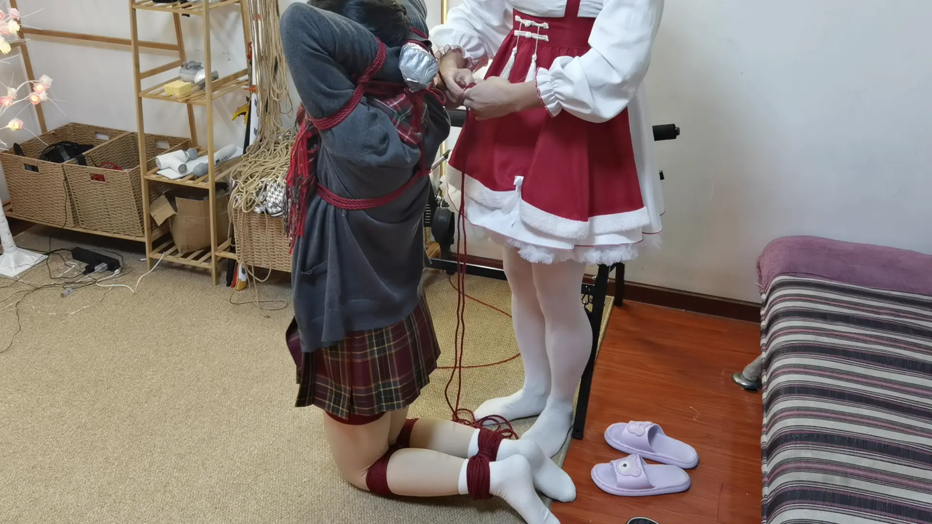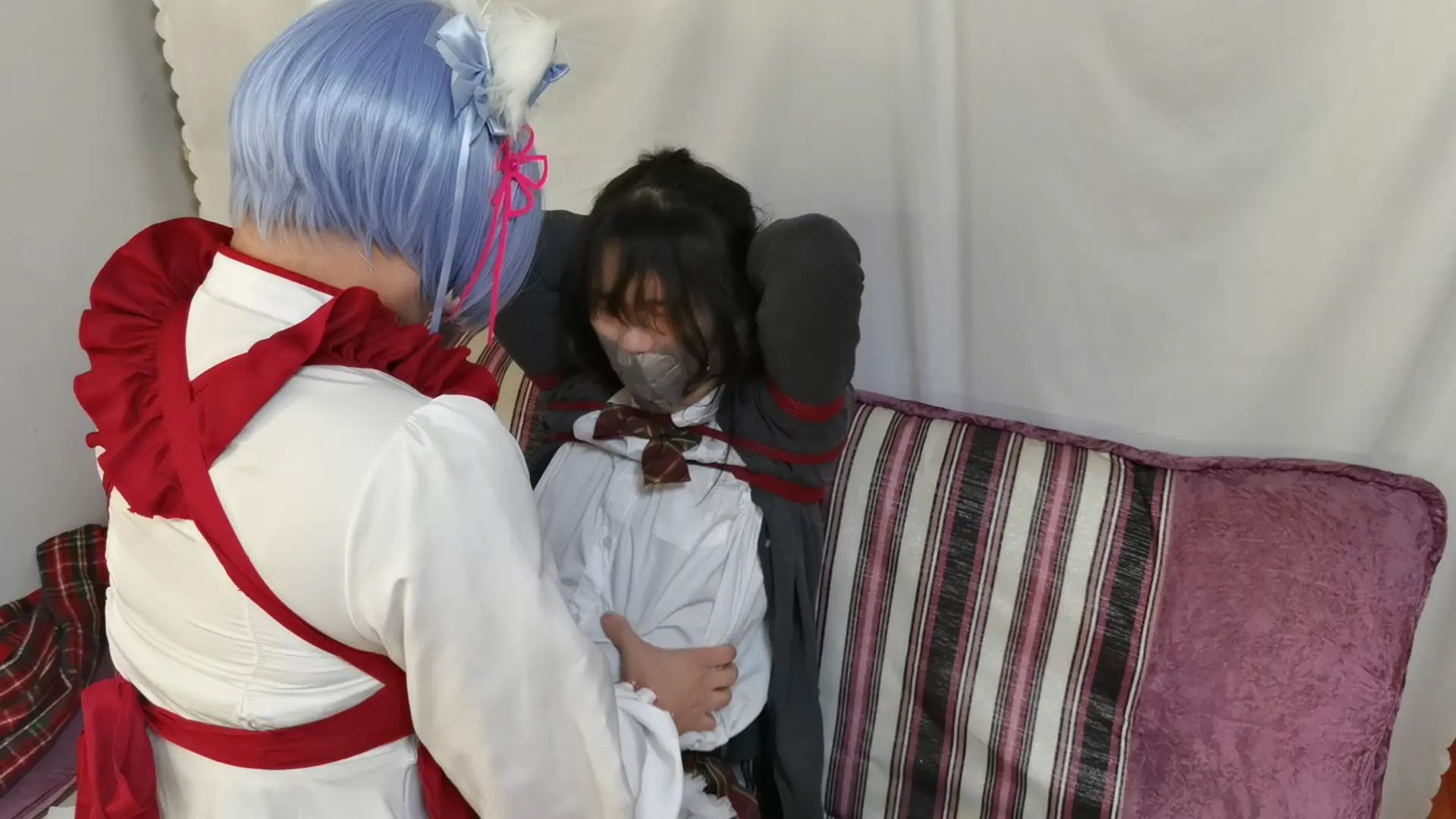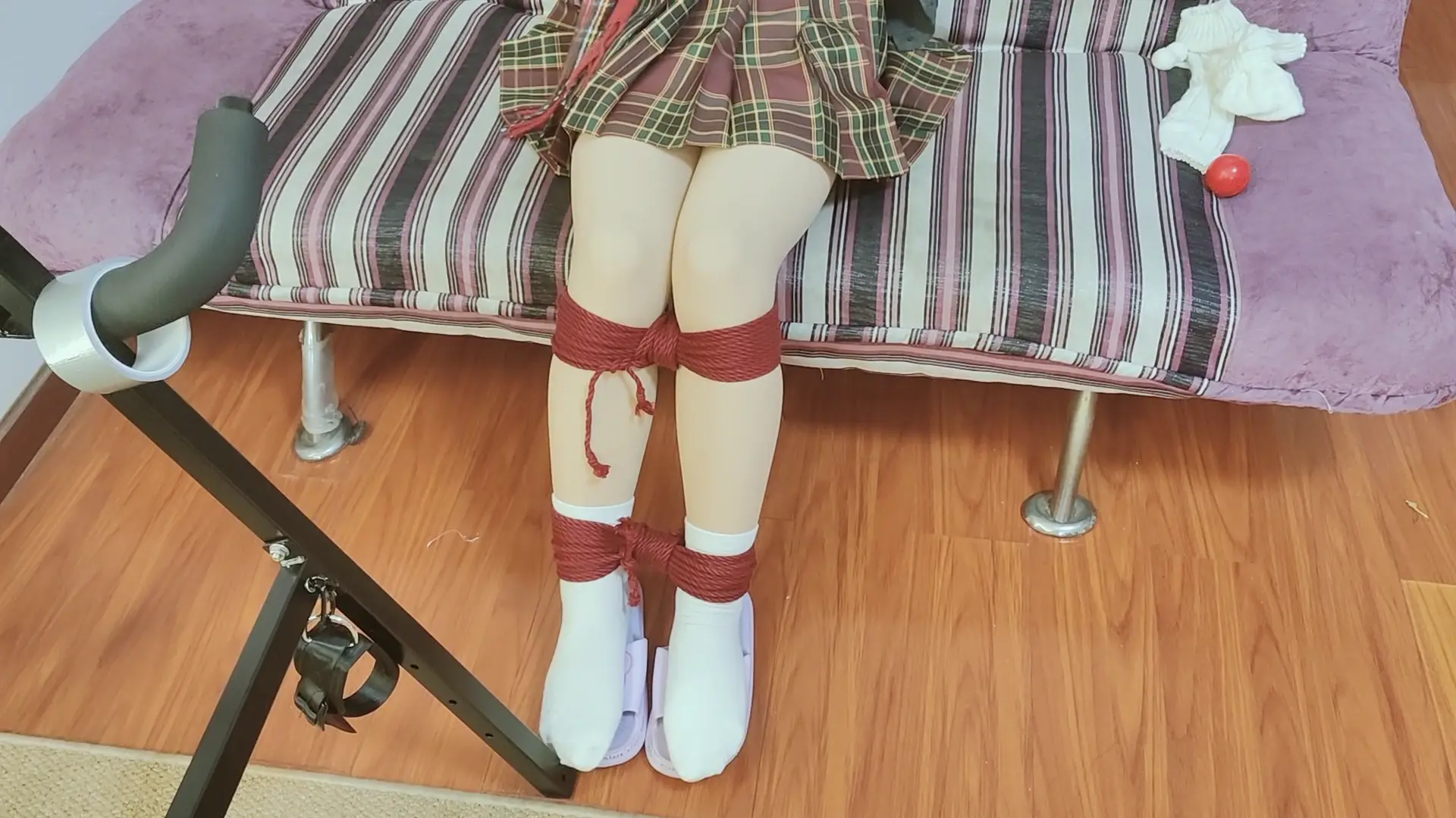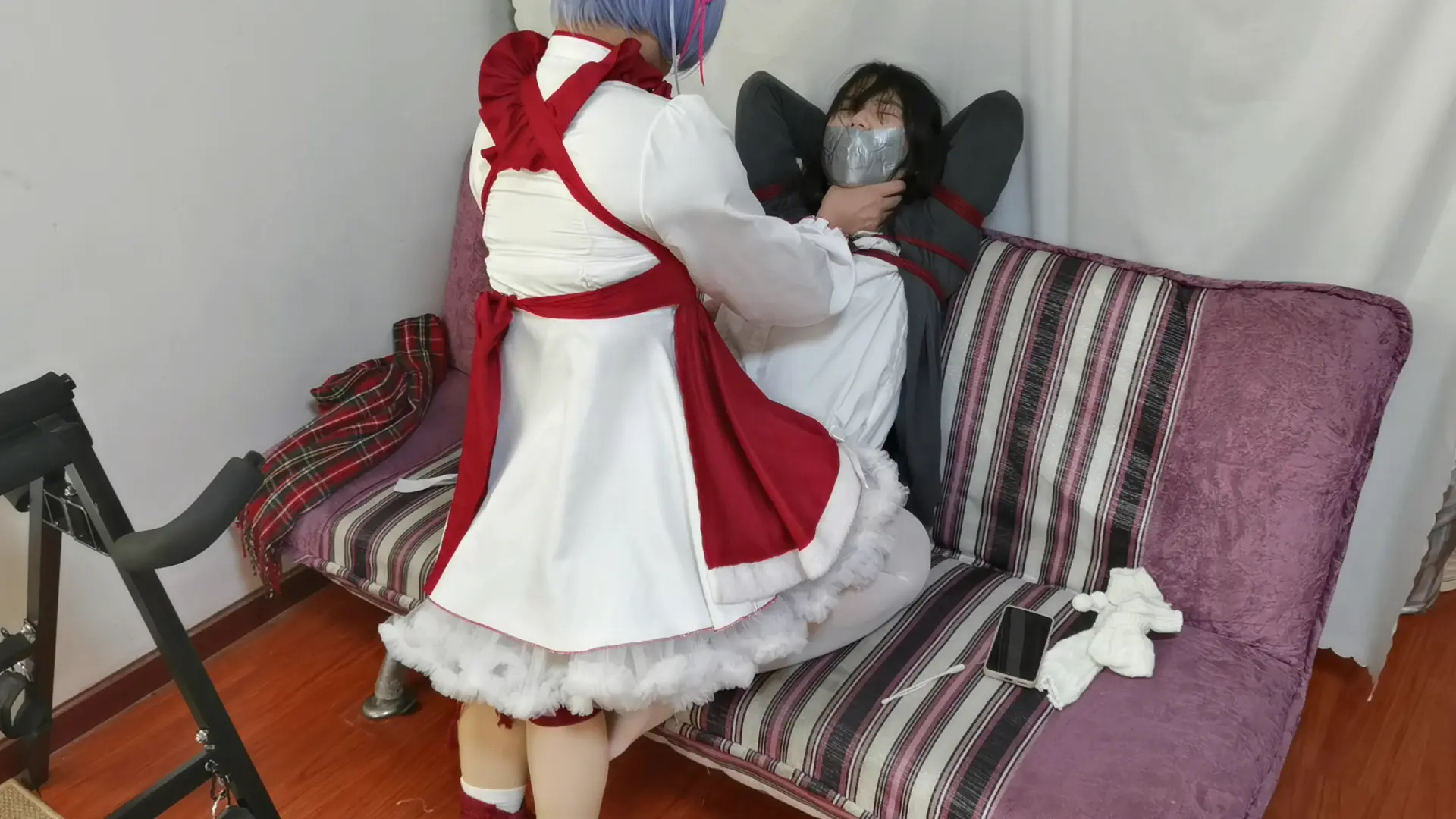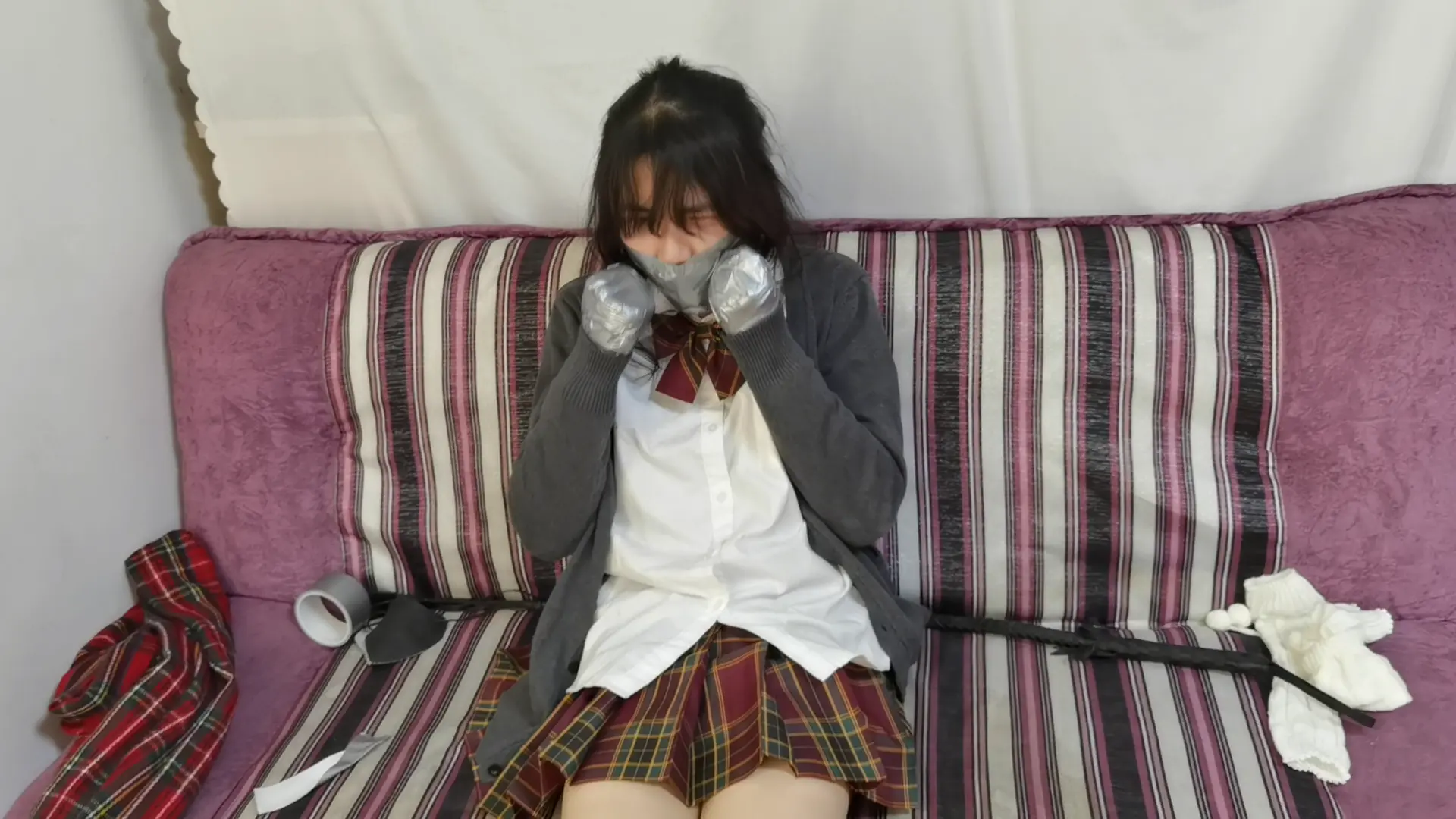 梦境里,大s陈其不备将小秃的双手裹成圆滑的小球,十指任由其骚动,都逃离不出银色胶带所打造的牢笼。接着小秃手向上被举过后背,加之束缚起来,将身前的弱点尽数暴露出来,接下来大s并不打算让他双脚紧紧并起而是留有一丝余地,看看他在绝境之中如何逃脱。小秃缓缓睁开眼,身感束缚,环视四下,顿觉不妙,但马上他也要有口难言,硕大的红球无情的轰入了他的嘴,随之附上了手上同款胶带,旋即而来的是一阵一阵的瘙痒,在这样的梦境中小秃绝望的祈求着梦醒时分到来。