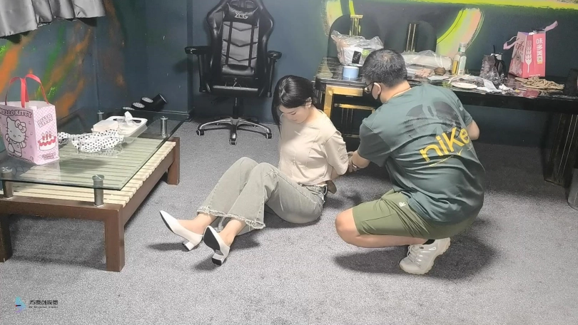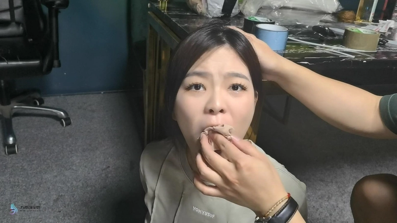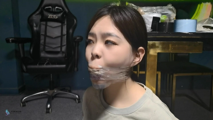 梦琪围着房子转了一圈,被人用手堵住了嘴。绑匪把她带到一把椅子上,开始用绳子把她的手绑在椅子后面。她一直在挣扎,但没有用。他把她的腿绑起来,把她的手腕和腿绑在椅子的底座上。然后他用白色的布条勒住住了她的嘴。然后他用胶带把它贴在裂口上。然后他把她的手指粘在一起。她只能苦苦挣扎。经过1分钟或2分钟的挣扎,绑匪摘下她的封口,向她要钱。她不想给他。然后他解开她的手,把她拖到桌子旁。他用胶带把她的手绑在桌腿后面,然后把拉链绑在胶带上。他对她的腿和膝盖做了同样的事。她的脚和手肘也被拉链绑着。最后,他塞了一块布在她的嘴里,用胶带缠住她。她只能苦苦挣扎。