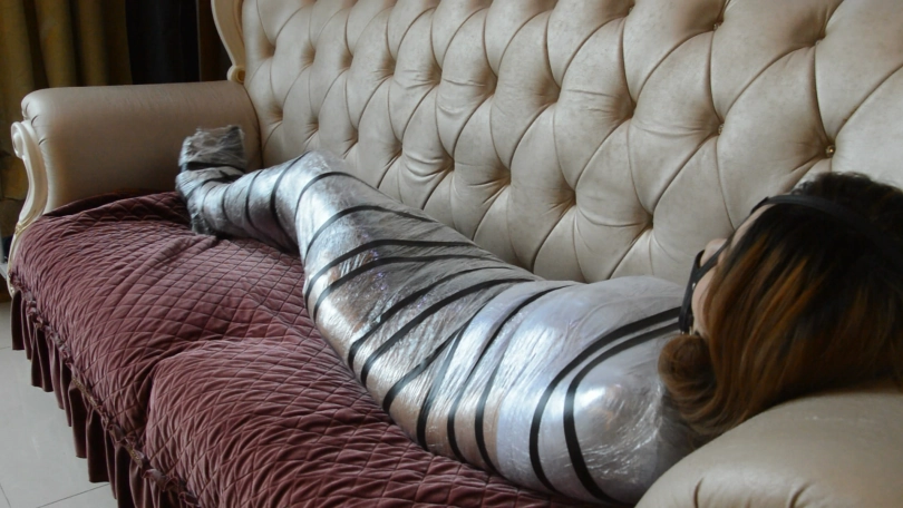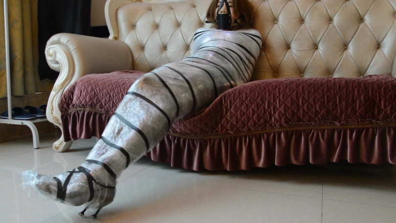 这次用的是店里的020号拉伸膜,拉伸膜是工业用的保鲜膜,硬度要比一般保鲜膜大,所以妹子想要挣脱开来必须用高跟鞋吧下面的捅破再从足部慢慢挣脱。