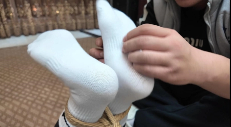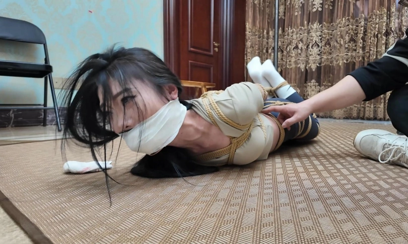 上集说到小偷用刀威胁女主说出了密码,然后又把女主捆绑得更加结实了。视频开头接上集,女主上半身已被直臂绑缚起来(手肘,手腕都被捆绑住),下半身依然绑着股绳,大腿根部,膝盖,脚腕都被绳子紧紧绑缚着,当然还少不了驷马倒攒蹄。看着被制服的美女,小偷真是蠢蠢欲动,尽是坏心思,只见小偷用一双白棉袜塞入女主樱桃小嘴中,奈何樱桃小嘴太小,小偷只能退而求其次,将一只白棉袜塞入女主口中,将白棉袜塞入女主口中后,小偷又用五张黑色布基胶带封住女主嘴巴,捏捏她的肚子后,女主发出呜呜呜的声音,小偷觉得她还能叫喊不放心,又用白色绷带将女主嘴巴缠绕封上,这样,女主彻底被剥夺了说话的权利,也无法挣脱嘴巴的束缚,手脚又被结结实实的捆绑,只能任由小偷摆布玩弄了,小偷也不客气,对女主上下其手,挠脚心,挠腰部,摸胸都使出来了,女主就算再难受也只能发出呜呜呜的声音和露出楚楚可怜的眼神。玩弄了一会的小偷也是腻了,抓住女主的头发让她抬头再贴近她的耳边后说到:我要出去取钱,你给我老实呆着,要是我发现密码不对,我回来有你好果子吃,听到没有?女主呜呜呜含糊不清回答:密码真的,不敢骗你。说罢,小偷起身踹了女主一脚随后离开,女主在原地挣扎并发出呜呜呜声音,镜头多角度,多特写把女主挣扎真实的记录下来。女主也是费力挣扎扭动身子并发出呜呜呜声音,最后也是徒劳无功,默默低下了头,等待着命运安排。