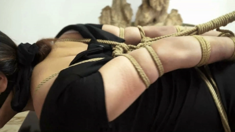 老张在地毯中央放上一张桌子,然后采用欧式直臂的方式将王蕾上半身绑好,加上股绳。最后驷马把她绑在桌子上。
