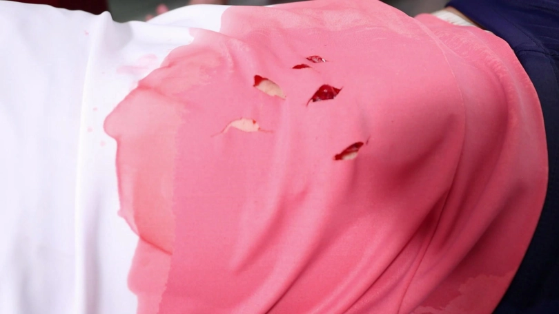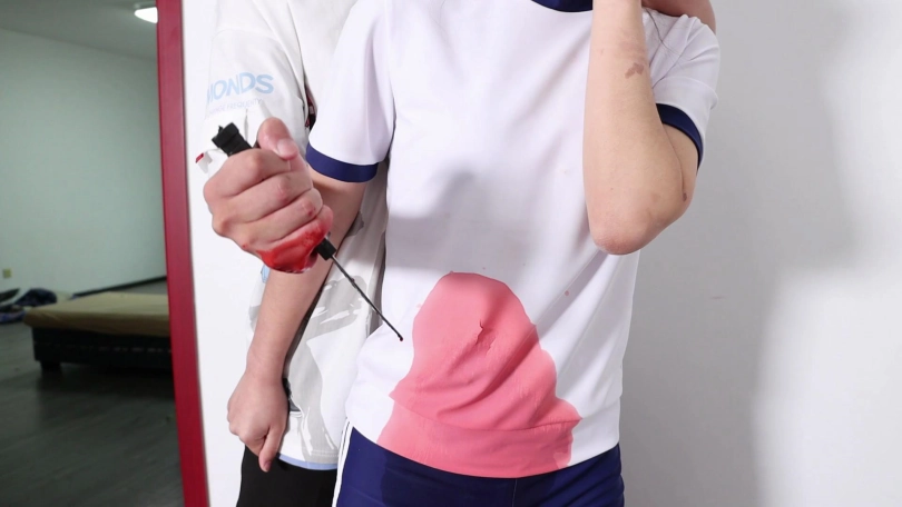 歹徒立即从背后紧紧捂住她的嘴并用匕首朝腹部疯狂地捅了七八刀,女主腹部出血。
