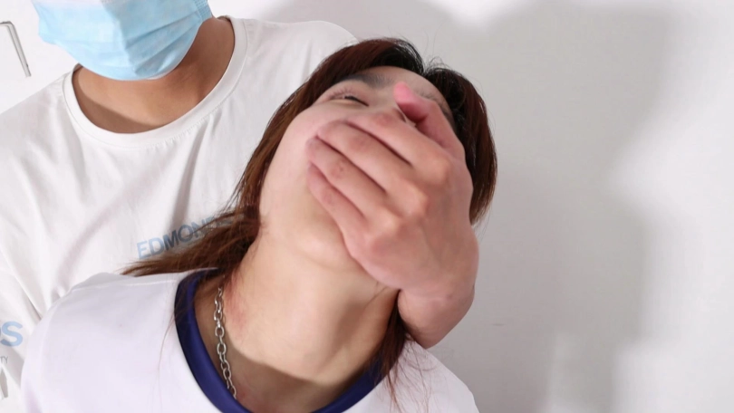 歹徒松开捂嘴的手,问钱在哪。刚松手,女主就大喊救命。